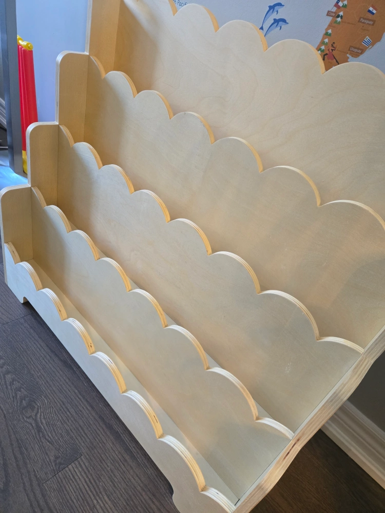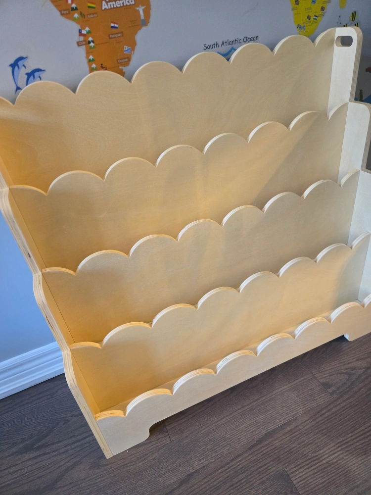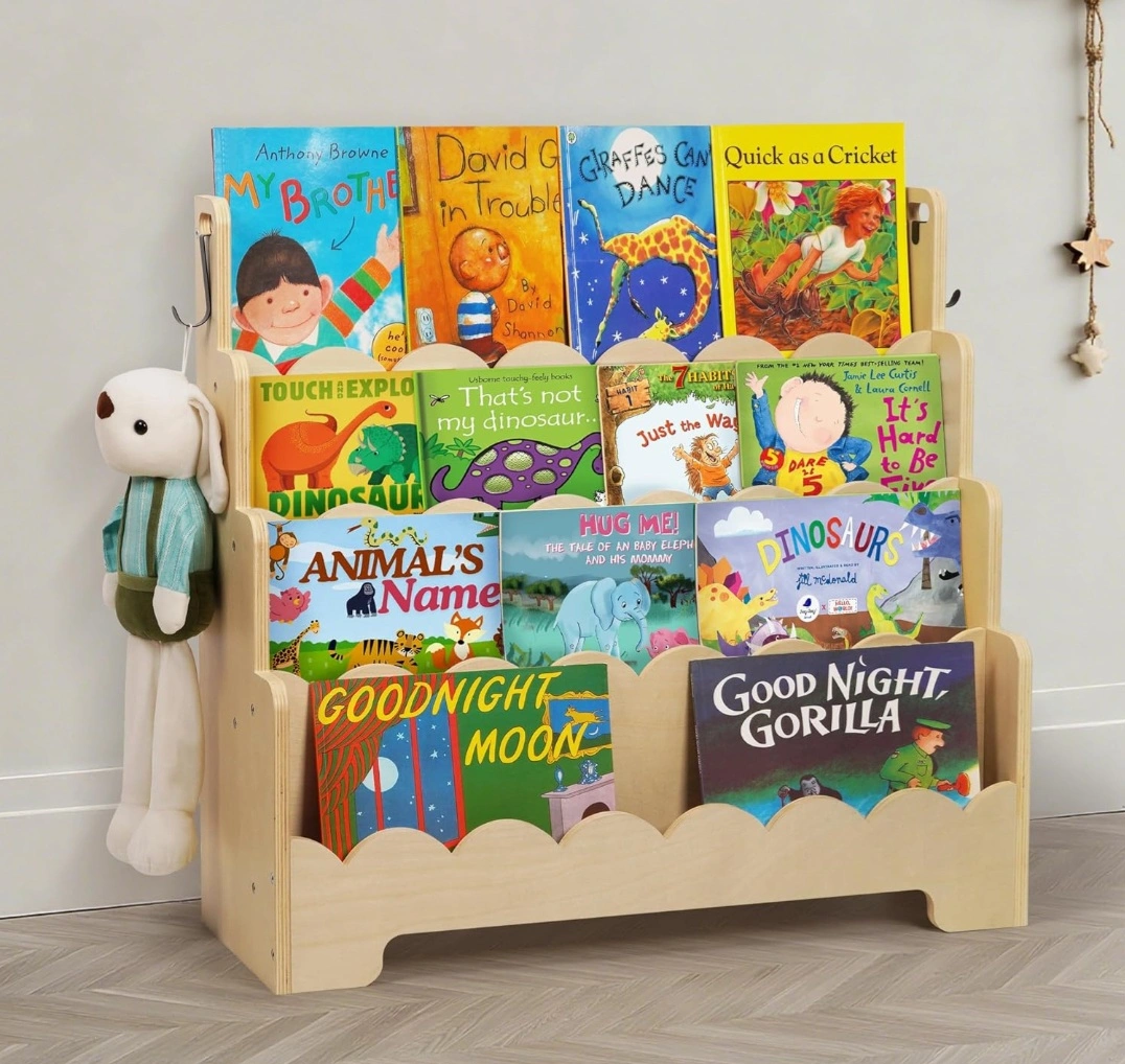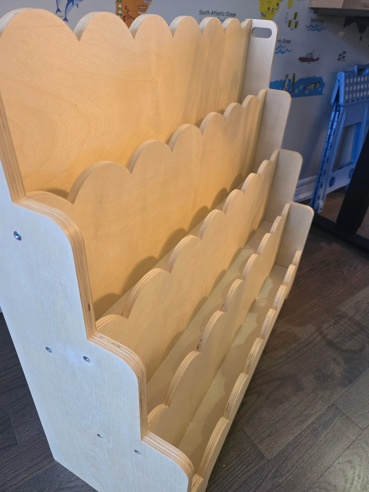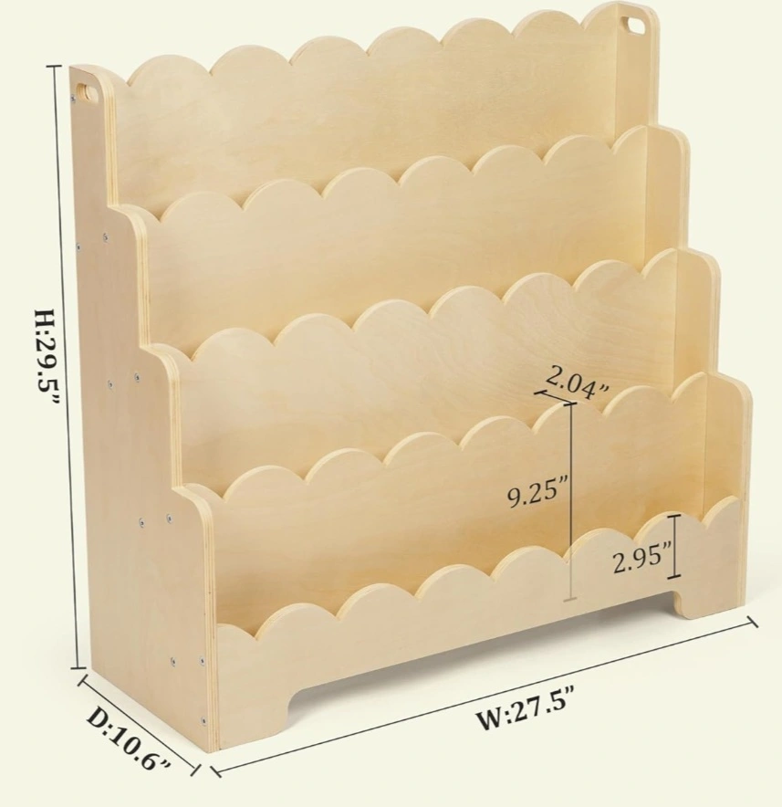 Kids Bookshelf Wooden 4-Tier, Scalloped Book Shelf for Kids Rooms, Front Facing Toddler Montessori Bookshelf, Baby Nursery Book Shelves Kid Classroom Book Shelf Bookcase. Key specs: - Height: 29.5" - Width: 27.5" - Depth: 10.6" Already Assembled and Ready to Use!!