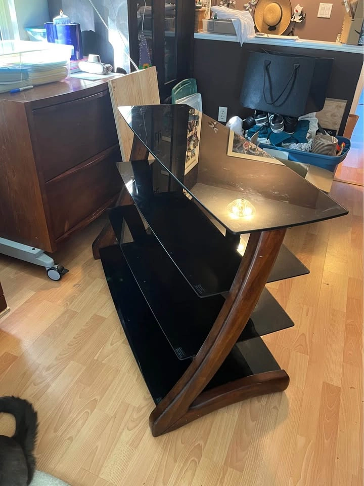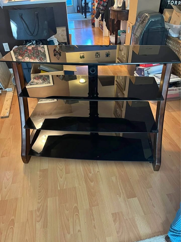 654 tiered, black glass TV shelf in a graduated configuration. Dimensions: LxHxW 43x30x20” You’ll need two people to move it. I’m located near 188th Street and 64 avenue in east Cloverdale ( Clayton Heights). Thanks for your interest. 🙂
