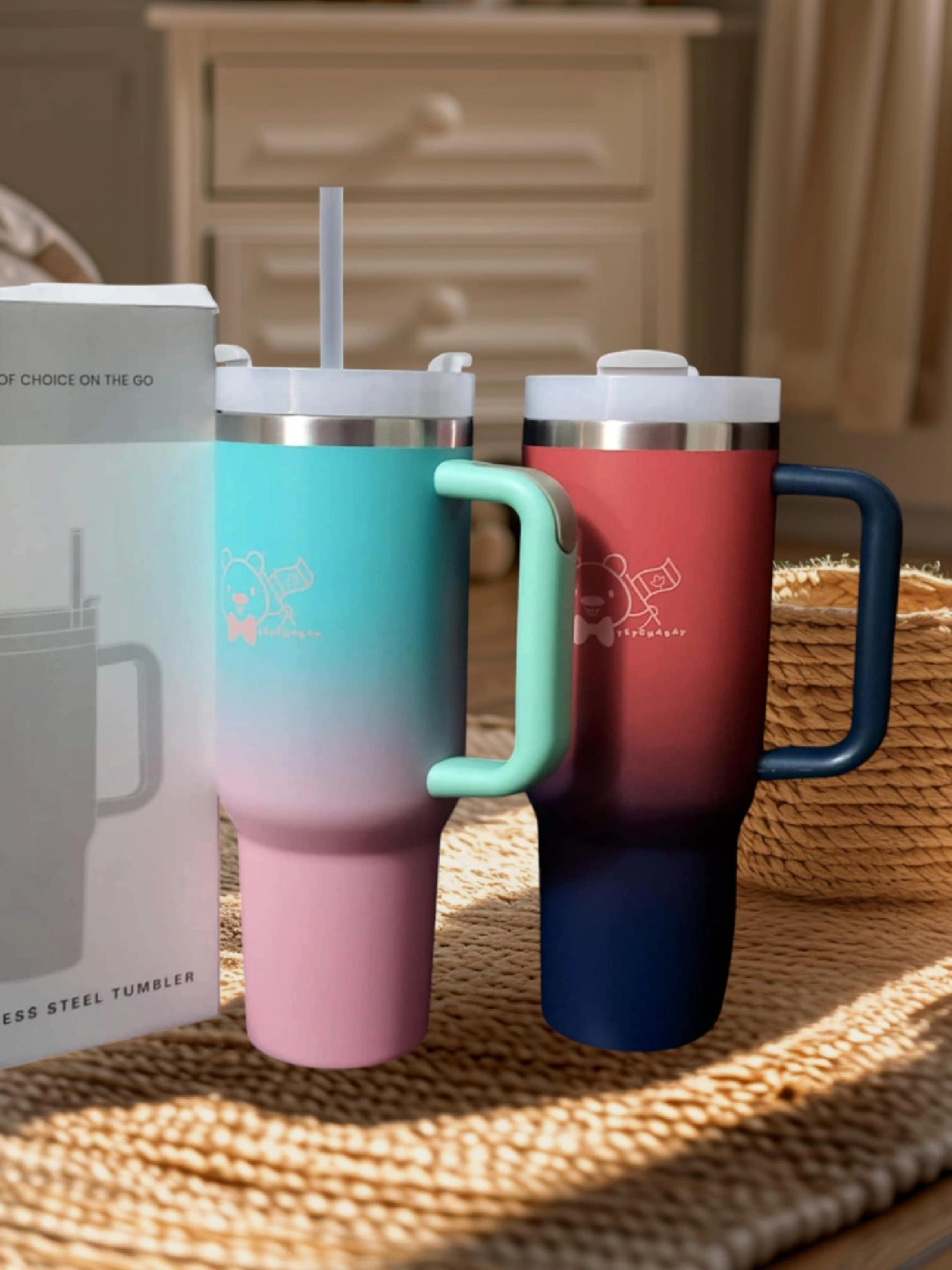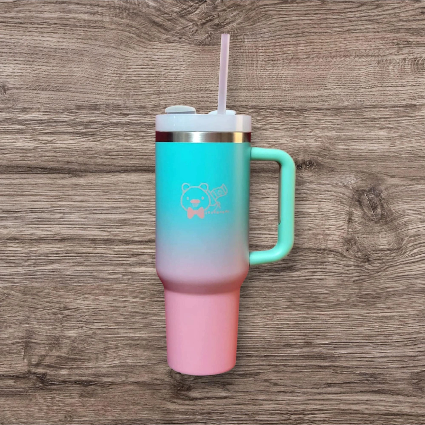 15I'm selling a 40oz travel mug with a handle. It features a cute bear design and comes in two stylish colour options: a vibrant red-to-navy and a refreshing teal-to-pink. Perfect for keeping your drinks at the right temperature on the go