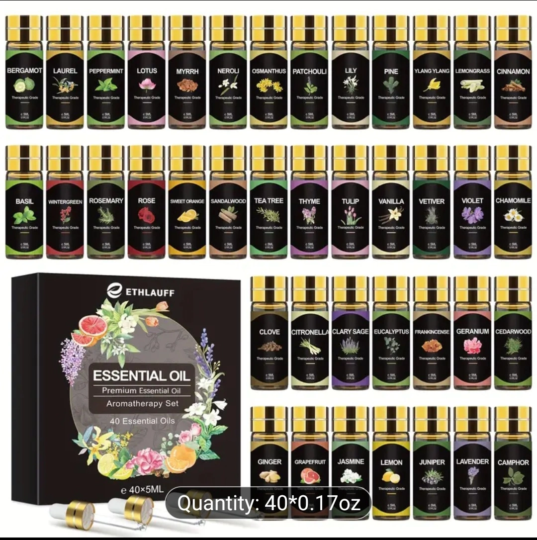 111Selling a premium essential oil aromatherapy This set includes 40 different essential oils, each in a 5mL bottle. Perfect for aromatherapy and creating a relaxing atmosphere in your home. Includes Bergamot, Laurel, Peppermint, Lotus, Myrrh, Neroli, Osmanthus, Patchouli, Lily, Pine, Ylang Ylang, Lemongrass, Cinnamon, Basil, Wintergreen, Rosemary, Rose, Sweet Orange, Sandalwood, Tea Tree, Thyme, Tulip, Vanilla, Vetiver, Violet, Chamomile, Clove, Citronella, Clary Sage, Eucalyptus, Frankincense, Geranium, Cedarwood, Ginger, Grapefruit, Jasmine, Lemon, Juniper, Lavender, and Camphor