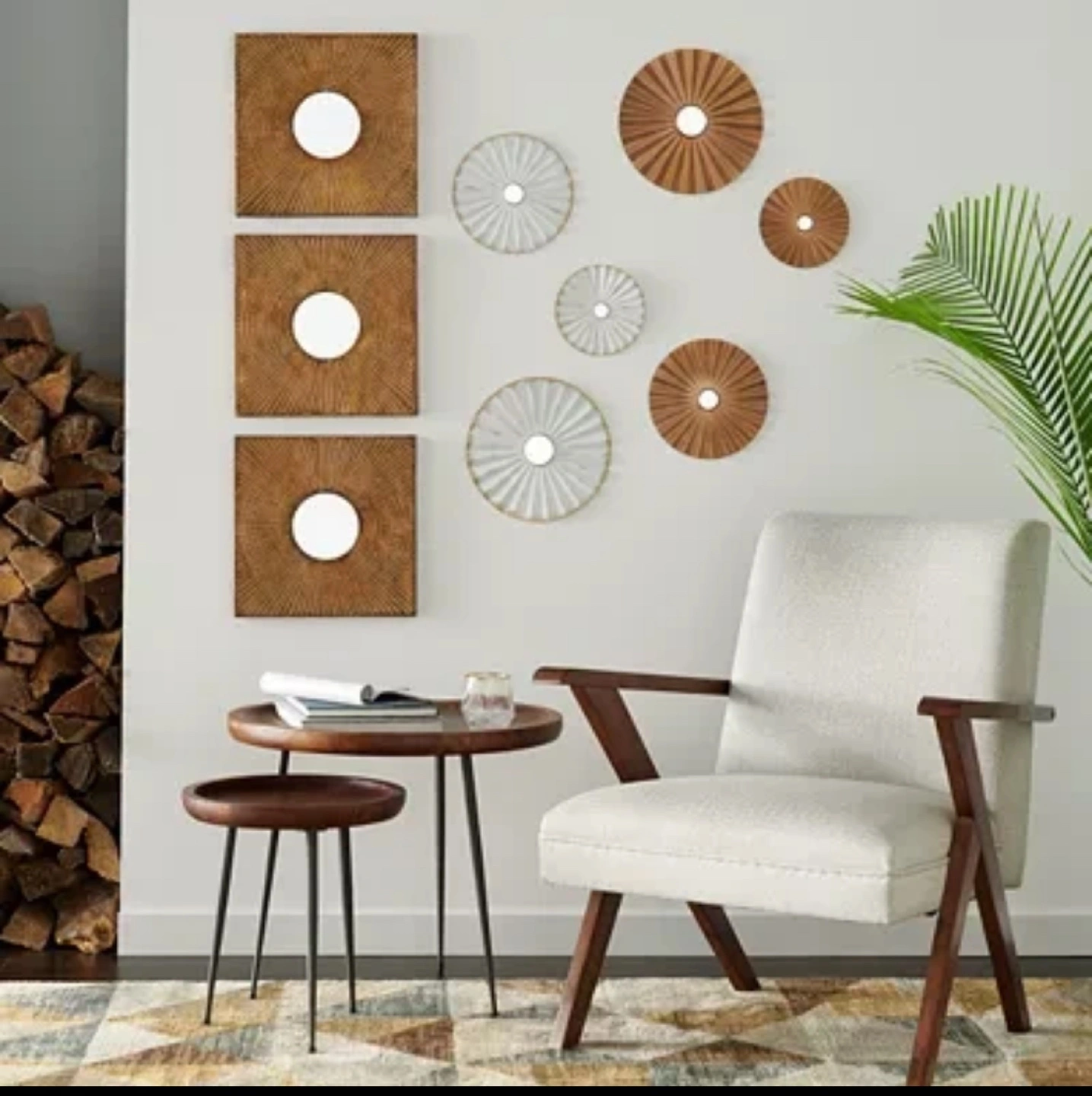 Decorative metal sunburst mirrors by SCOTT Living (aka Property Brothers!) in burnt orange.