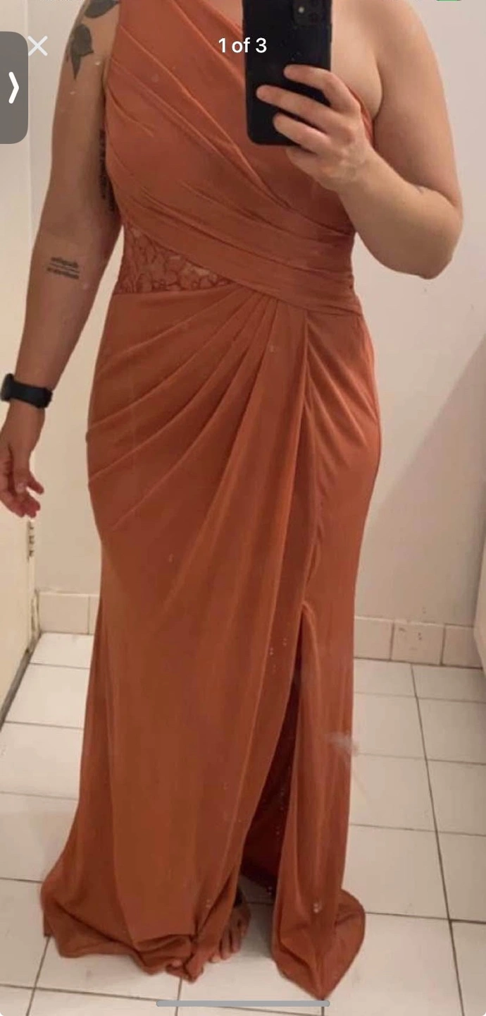 Stunning floor length gown. One-shoulder design. Features a high slit and lace detailing. Perfect for a formal occasion.