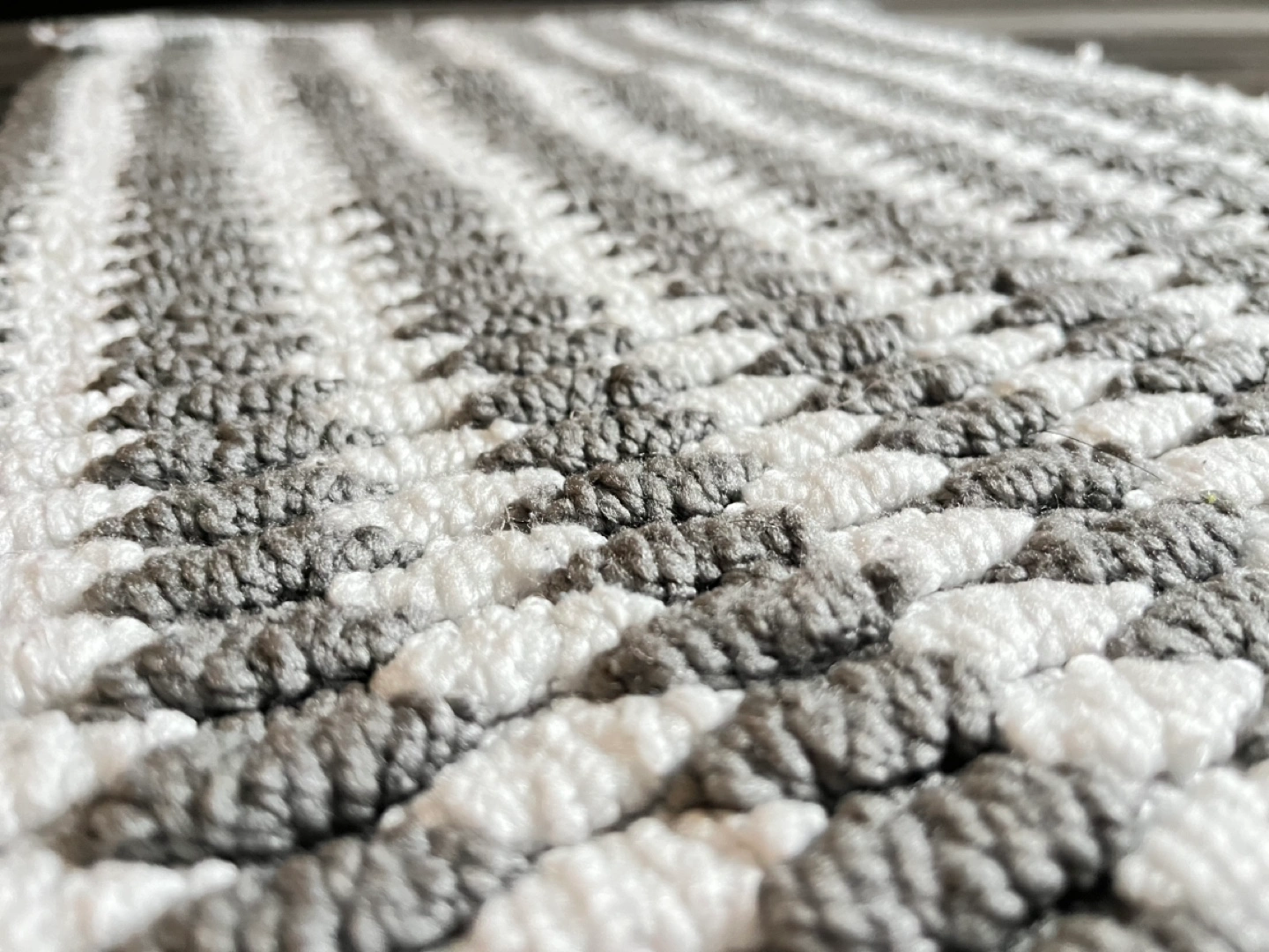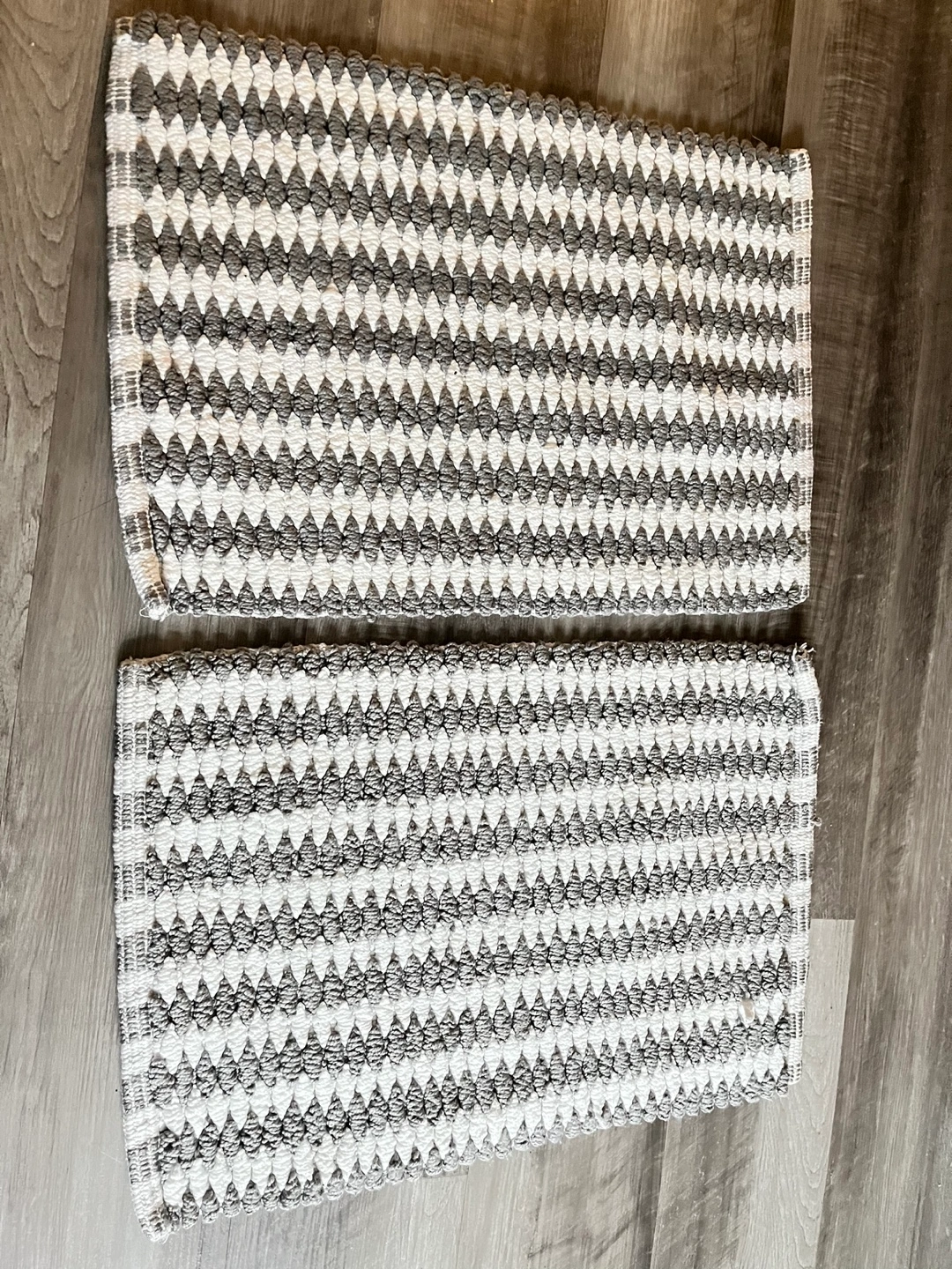 Two matching rugs. Grey and white colour scheme. Woven texture. Perfect for bathroom or kitchen.