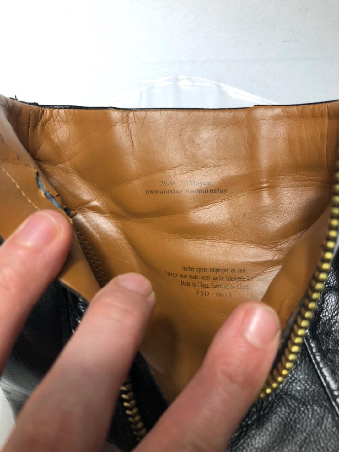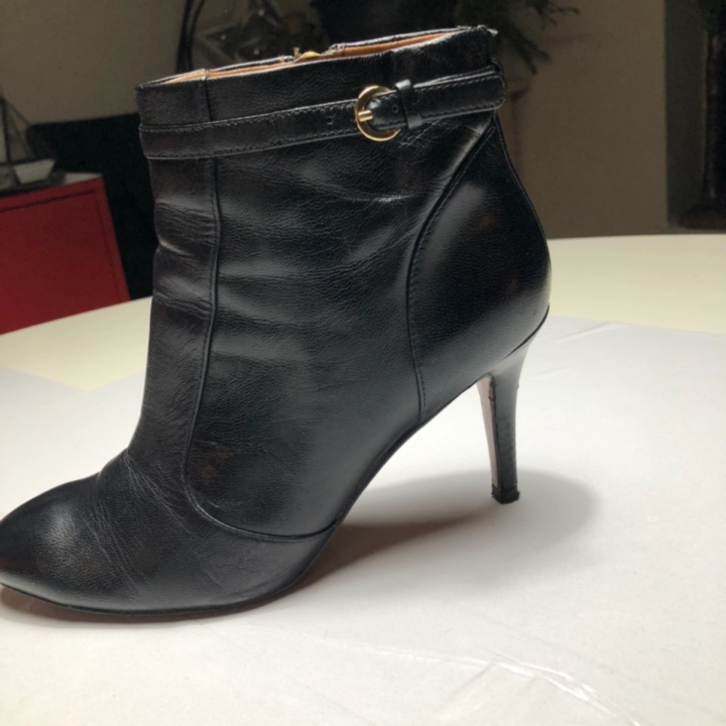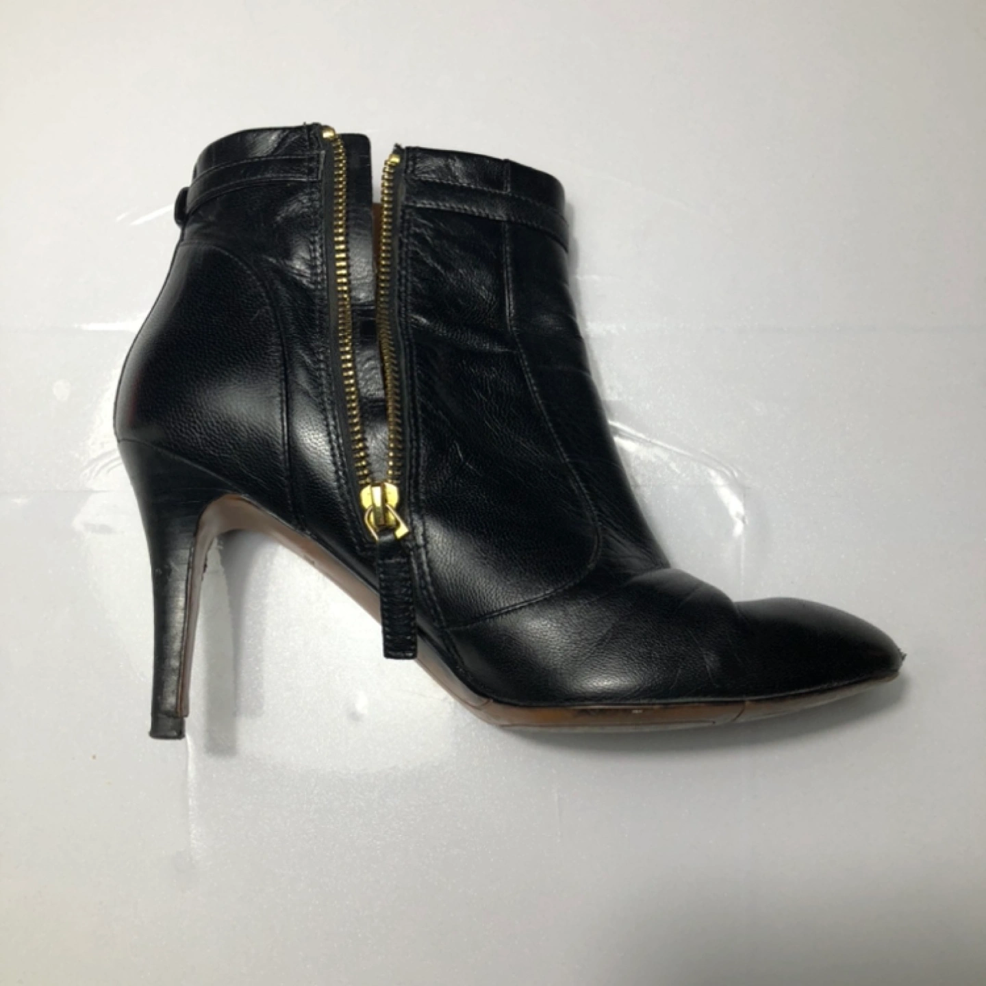 Nine West “Mainstay” black leather ankle booties. Features gold zippers and 3 1/4 inch stiletto heels. Slight wear visible on the lining inside one boot; otherwise in great condition. Very comfortable to wear.