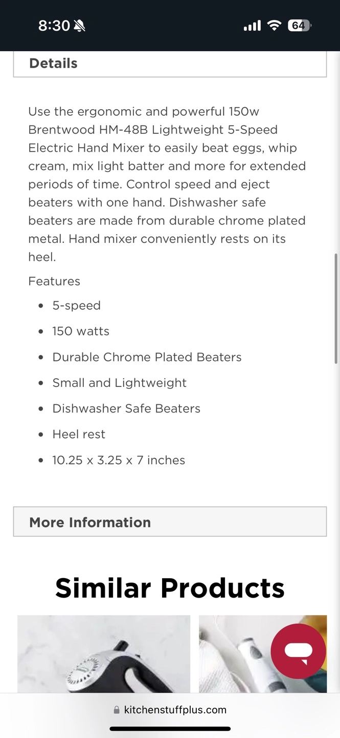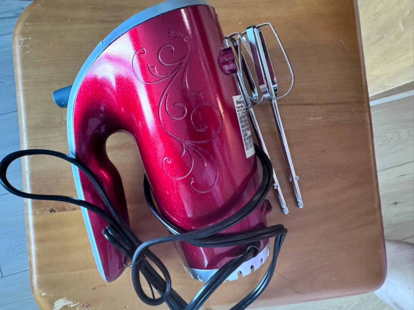 Ergonomic and powerful 150-watt hand mixer. Five speeds. Durable chrome plated beaters. Dishwasher safe. Small and lightweight. Convenient heel rest.