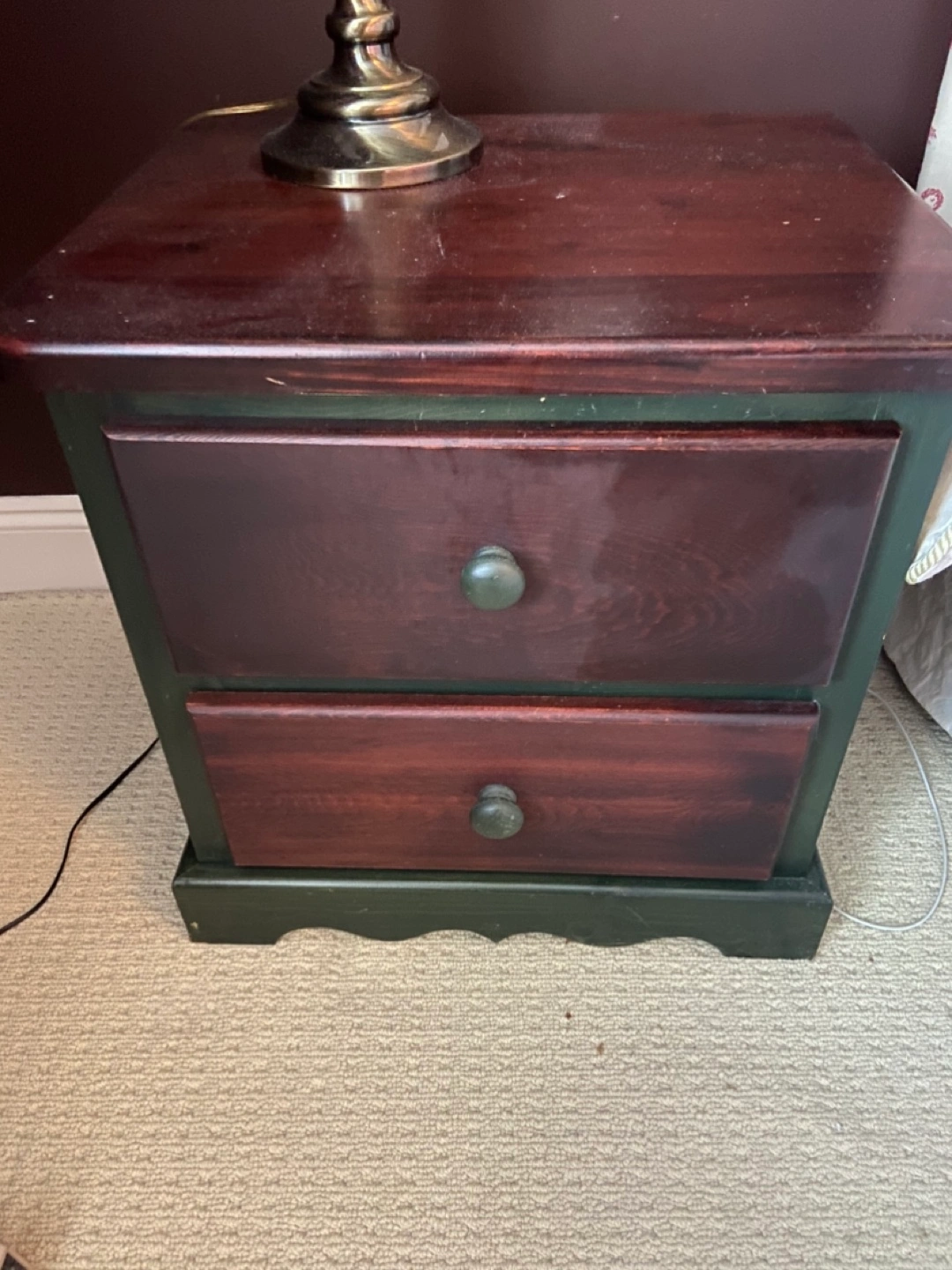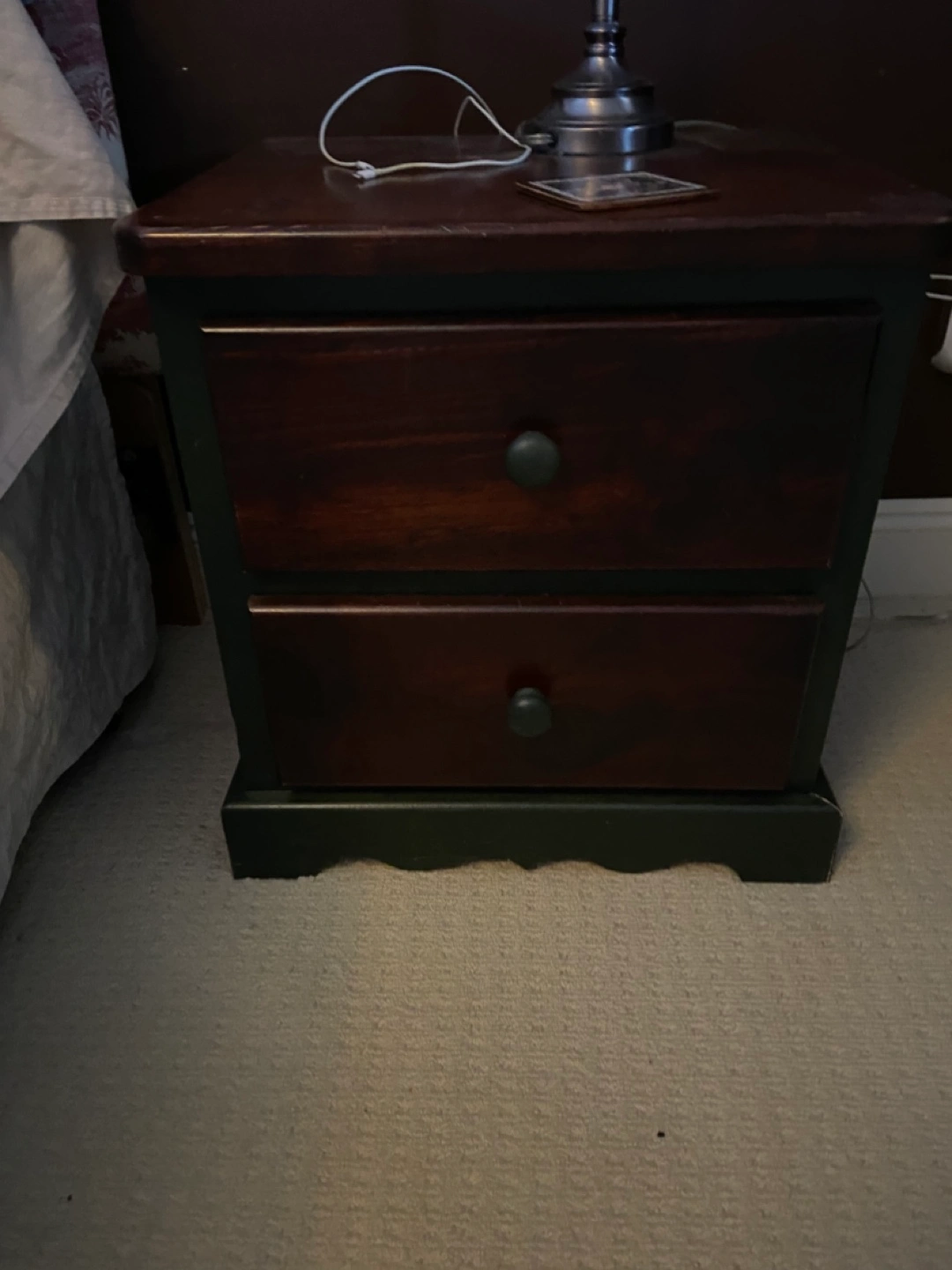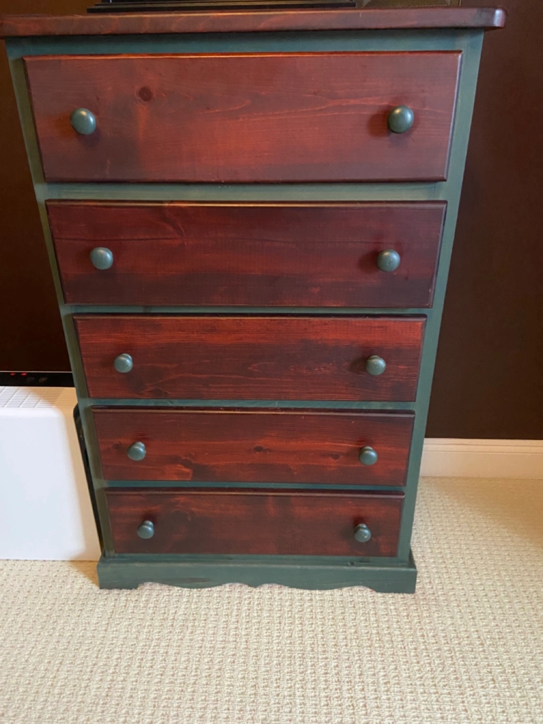 36Beautiful matching bedroom set. Five-drawer chest and two-drawer nightstand. Dark wood top with green base. Solid pine wood construction. Better than IKEA! Minor wear consistent with use.