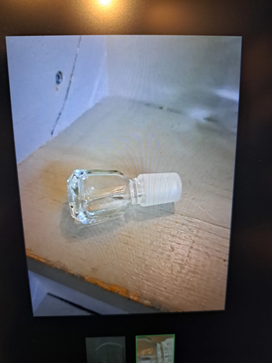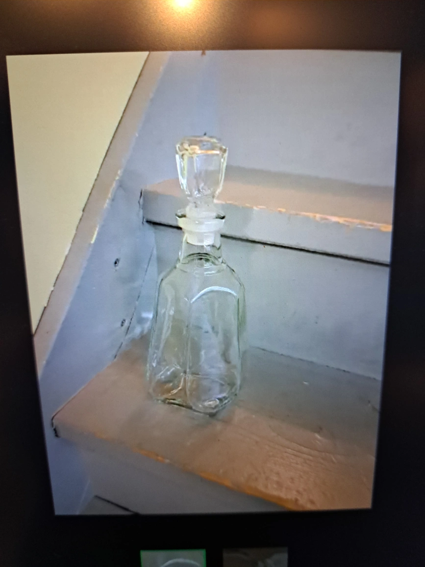 Clear glass decanter. Square body. Faceted design. White ground glass stopper. Vintage.
