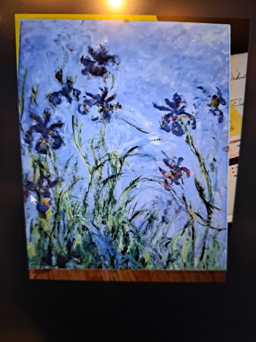 Framed print featuring Monet's Irises. Beautiful colours. Looks great on a wall. mounted between glass and Press Board.