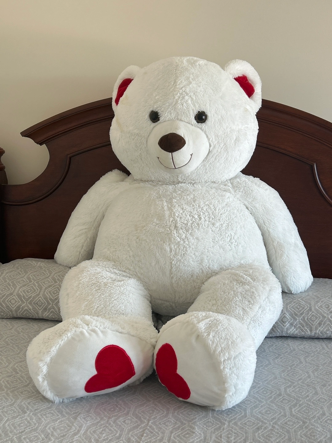 Huge plush teddy bear. White fur. Red heart-shaped patches on paws and ears. Excellent for cuddling or decoration. Large size.