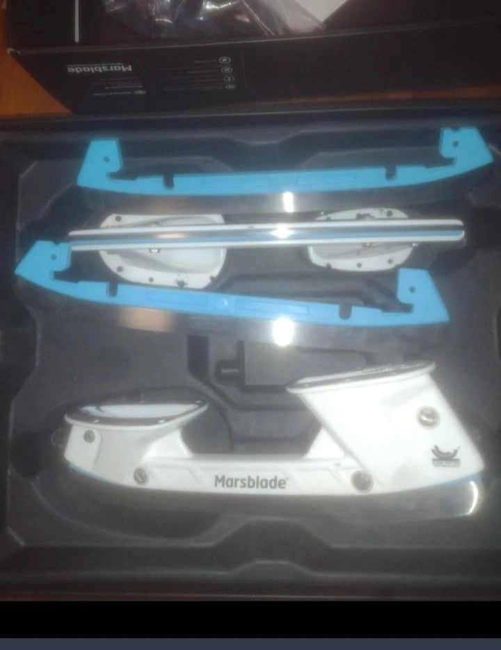 Speed enhancing Marsblade skate blades.... used once. Includes runners and holders. White with teal accents. Mars blades holders with 2 sets of steel runners. Nearly new, perfect condition. Size 263mm (7-7.5) skate, size 8-9 shoe. Sport science researched stride efficiency speed study at Brock University showed 5% forward speed increase with these blades.