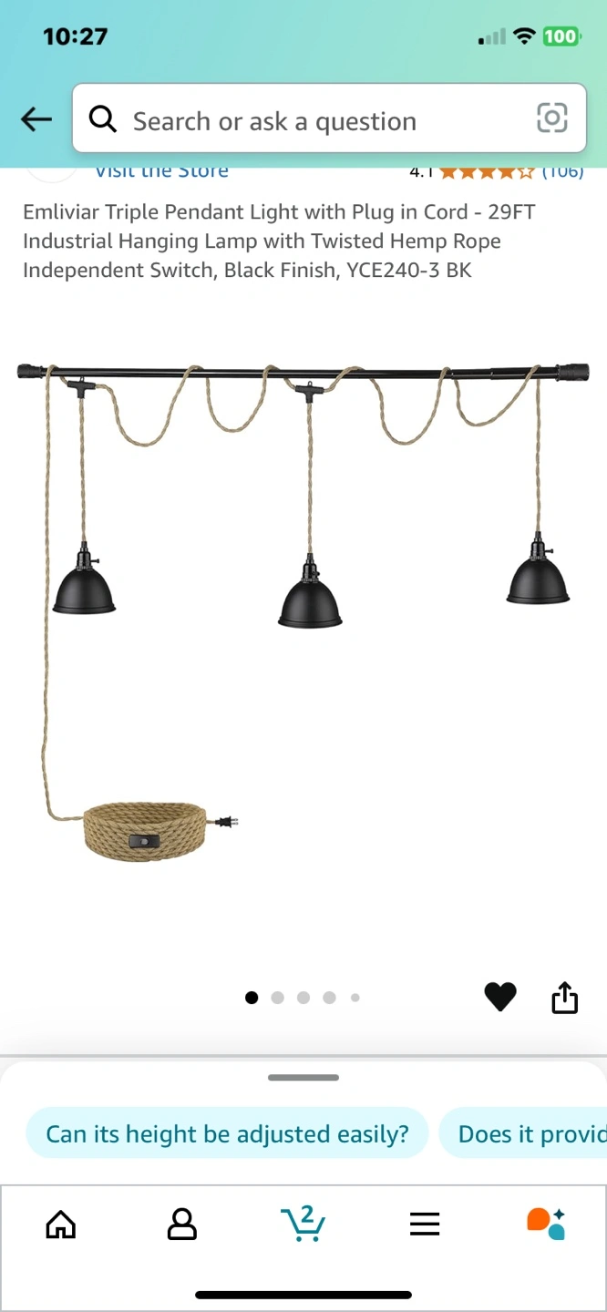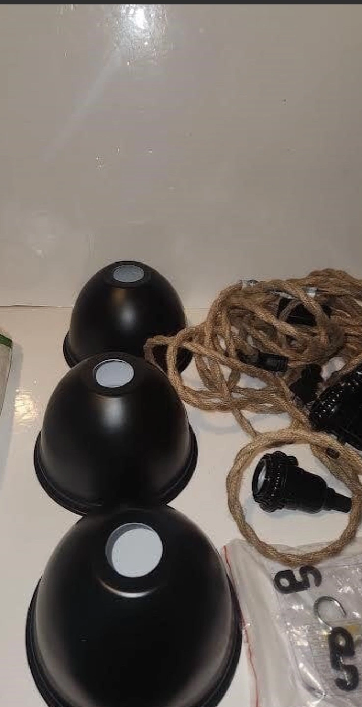 Three-light pendant lamp. Black finish. Twisted hemp rope cords. Includes independent switch. E26/E27 base, max 60W. LED, incandescent, CFL compatible. Bulbs not included. Easy height adjustment.