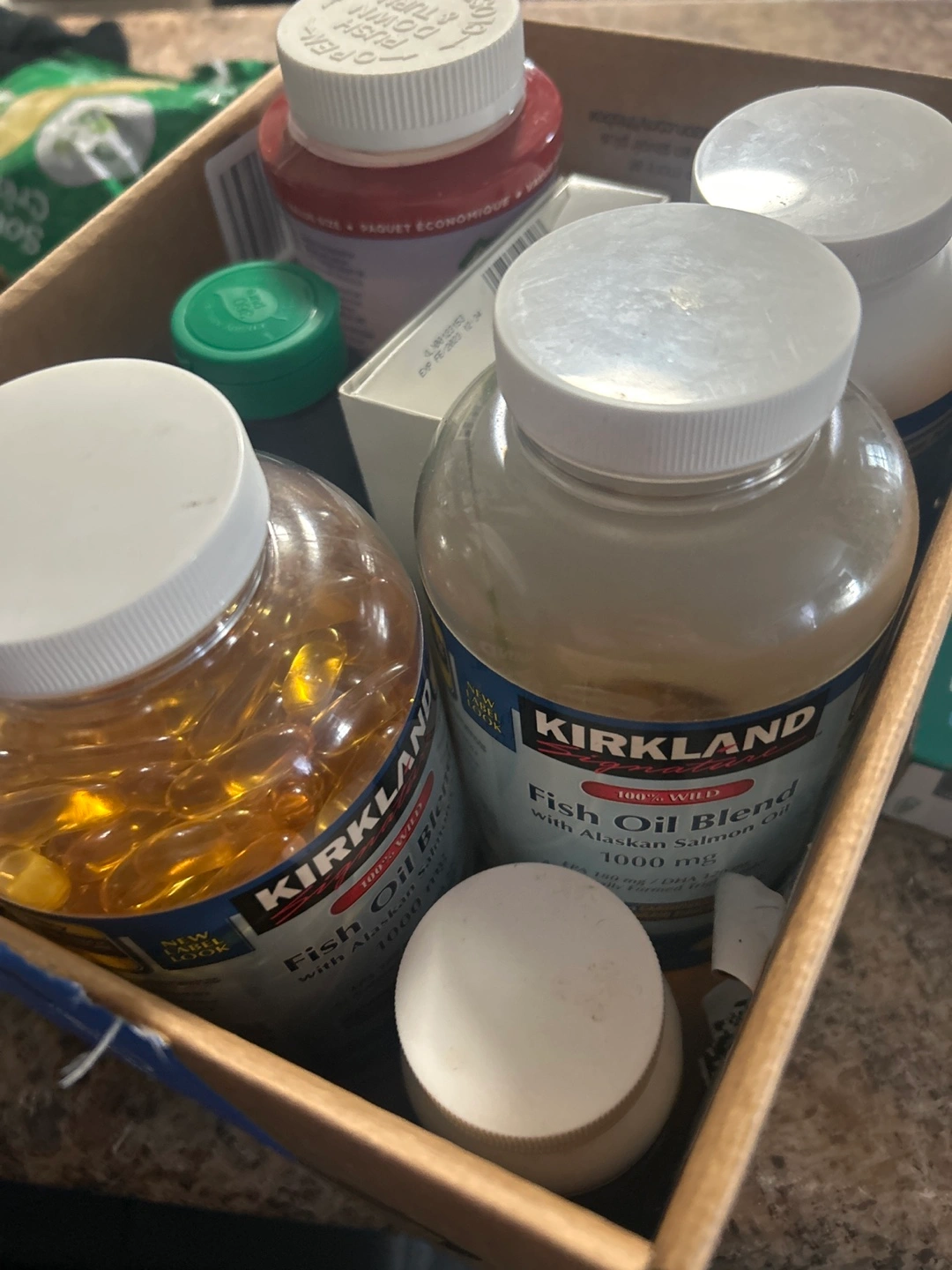 Two bottles of Kirkland Signature Fish Oil Blend with Alaskan Salmon Oil. 1000mg per serving. 100% wild. New label look.