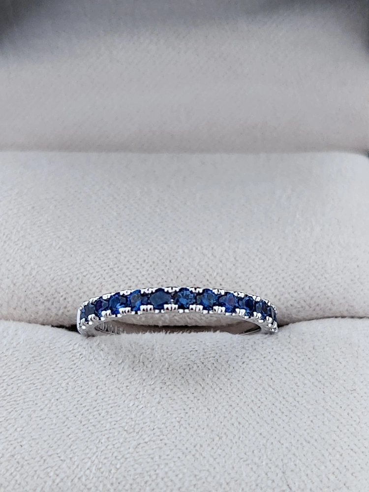 Here is a beautiful wedding ring design with delicate eternity band. Features small, round blue sapphires. White metal setting and has officially been appraised so of anyone is interested text me at 647-938-0257 and I only accept in person meet ups for payments