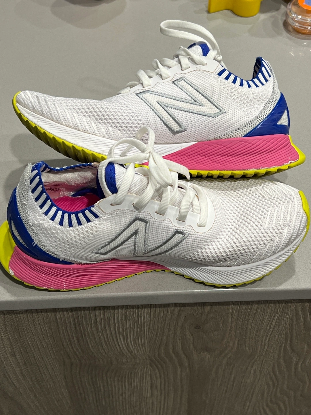 Pair of women's running shoes. White knit upper, pink and yellow accents. Good condition, some wear.
