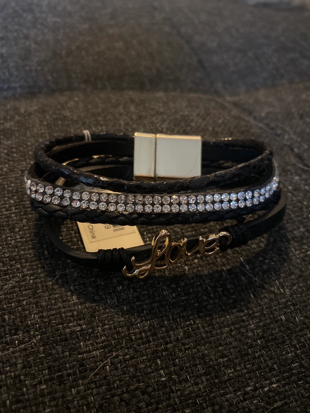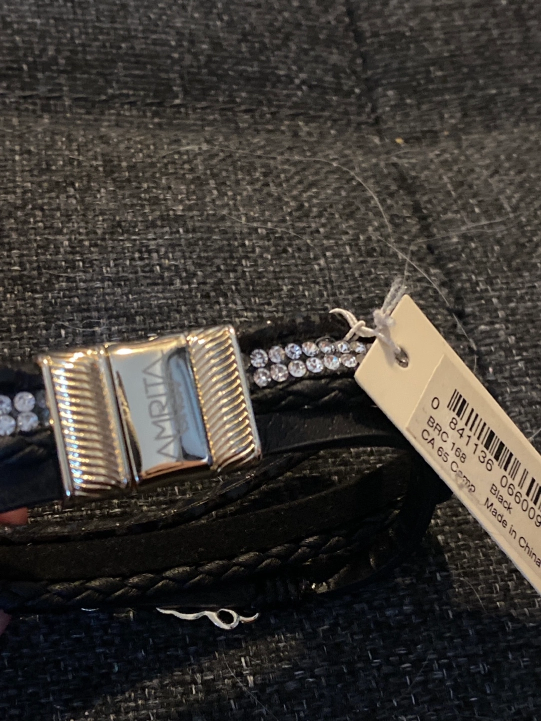 Multi-layered black leather wrap bracelet. Features a magnetic clasp and crystal embellishments.