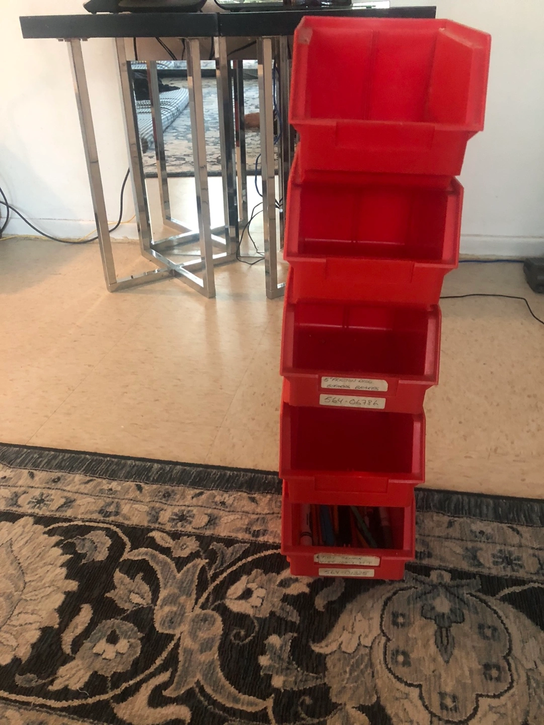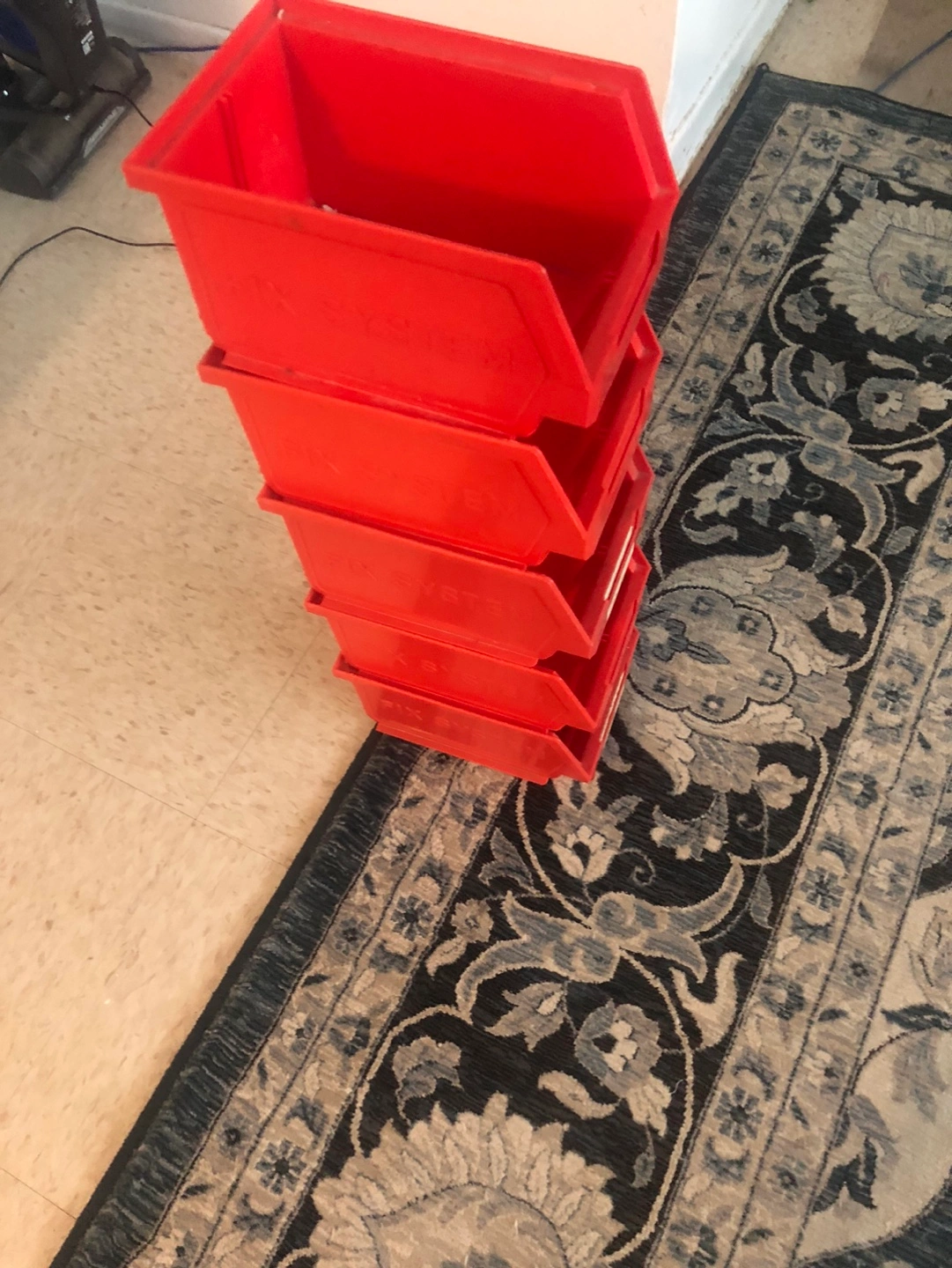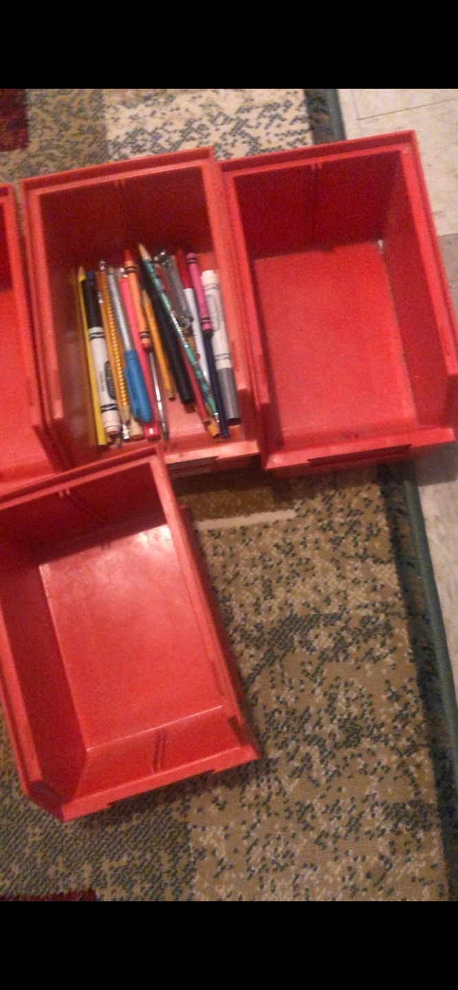 Five stackable plastic bins. Red colour. Good for organizing small items. Some minor wear.