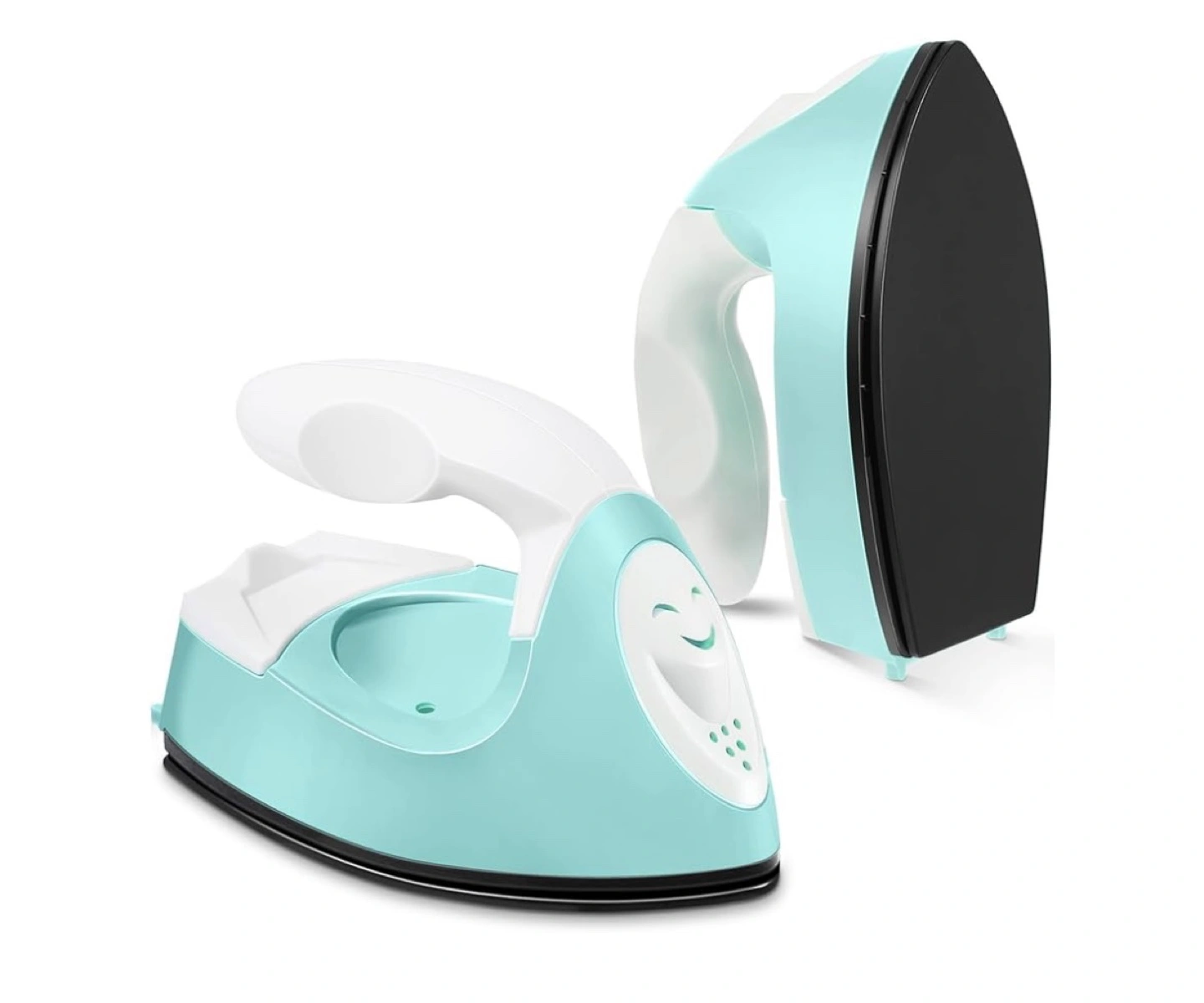 Compact travel iron. Perfect for small spaces. Features a light blue and white design. Easy to store.