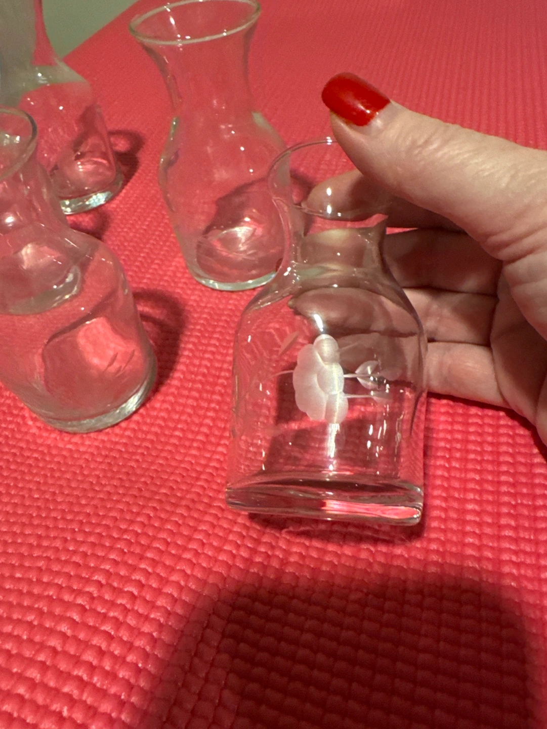 Set of five small, clear glass decanters. Etched floral design. Perfect for serving sauces, oils, or as miniature vases. Pre-owned, brand new condition. Price is for set of 4.