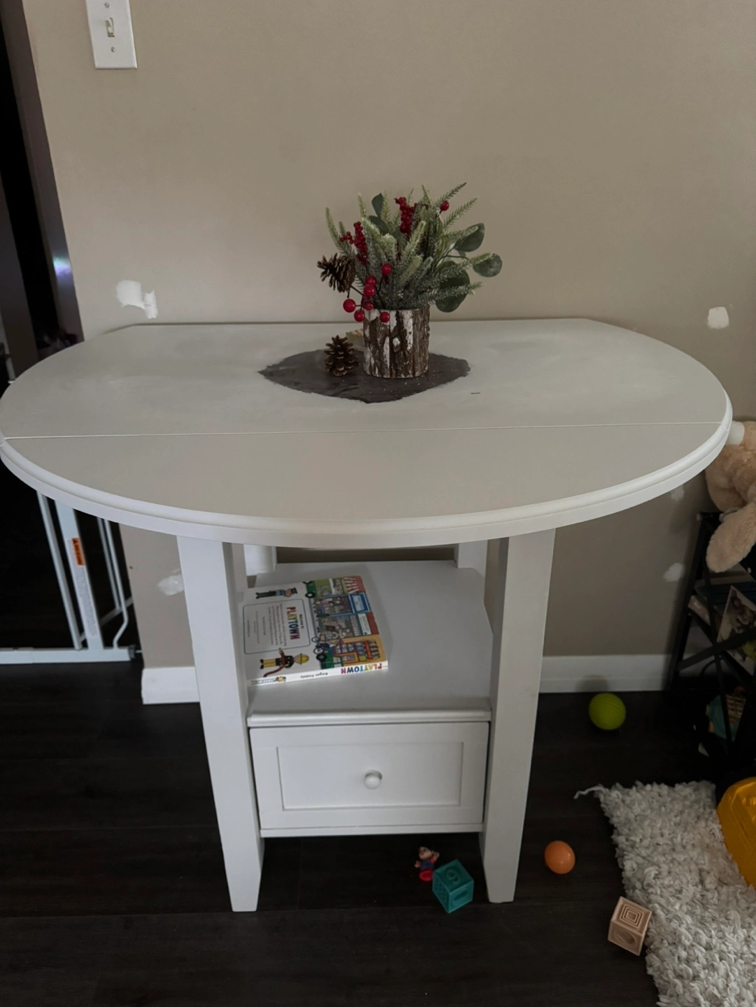 Small white drop leaf table. Features a small drawer for storage. Good for small spaces. Some minor wear and tear. Hand painted