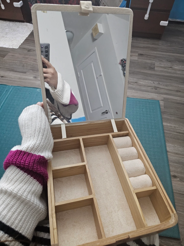 10Small wooden jewelry box. Beige felt interior. Multiple compartments. Mirror lid. Approximate dimensions 8" x 7". pick up only near huron and Adelaide. Cash preferred.