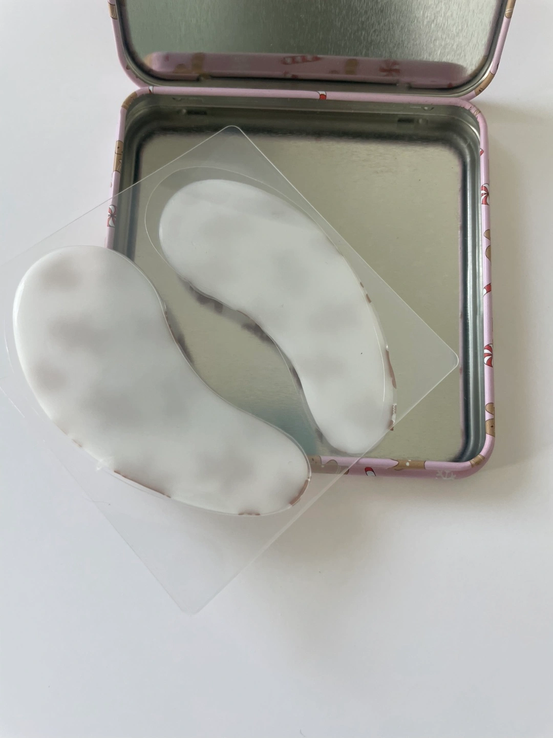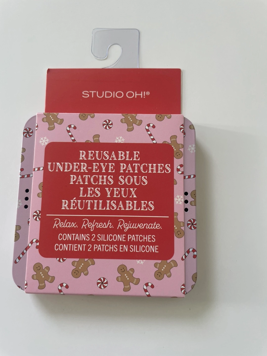 Silicone under-eye patches. Gingerbread and candy cane design. Comes in a reusable tin. Relax, refresh, rejuvenate.