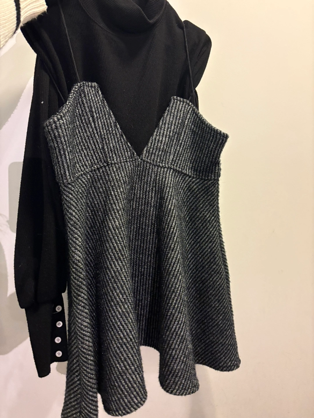 142Stylish grey and black tweed skater dress. Features a V-neck and thin straps. Can be paired with a black ribbed turtleneck sweater. Perfect for fall and winter.
