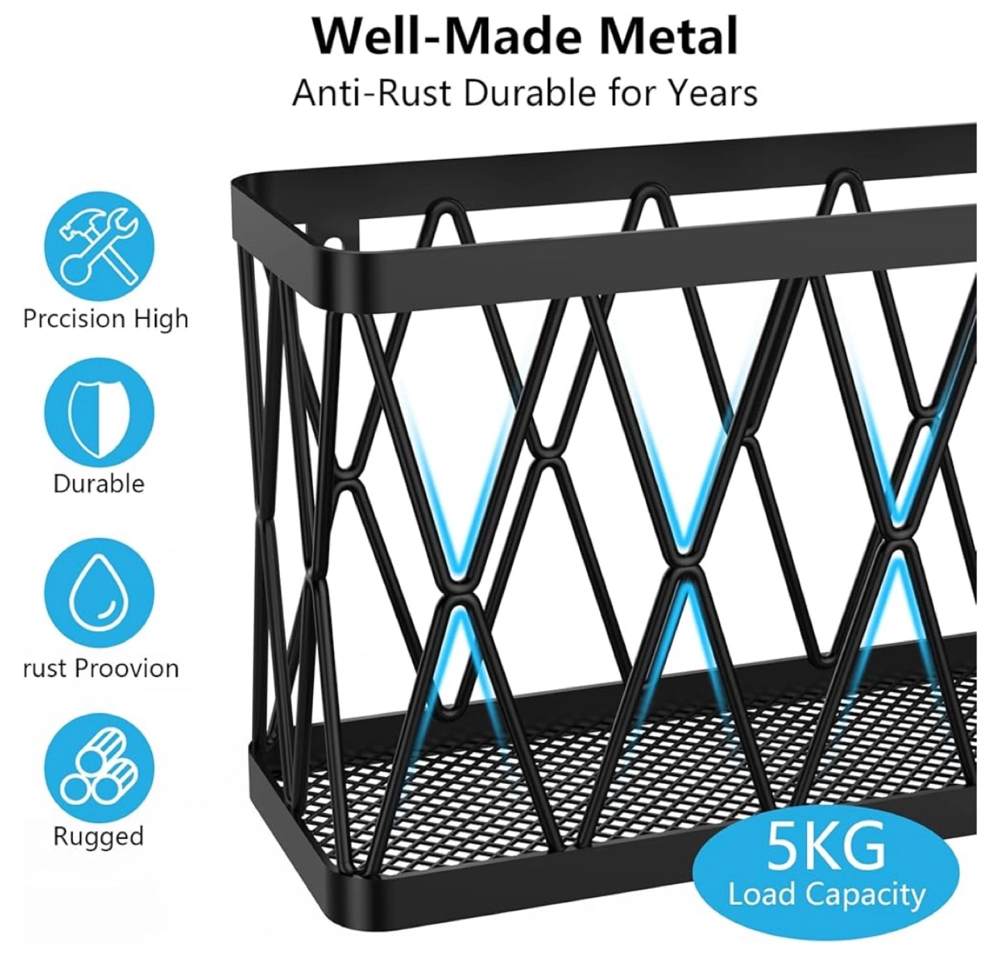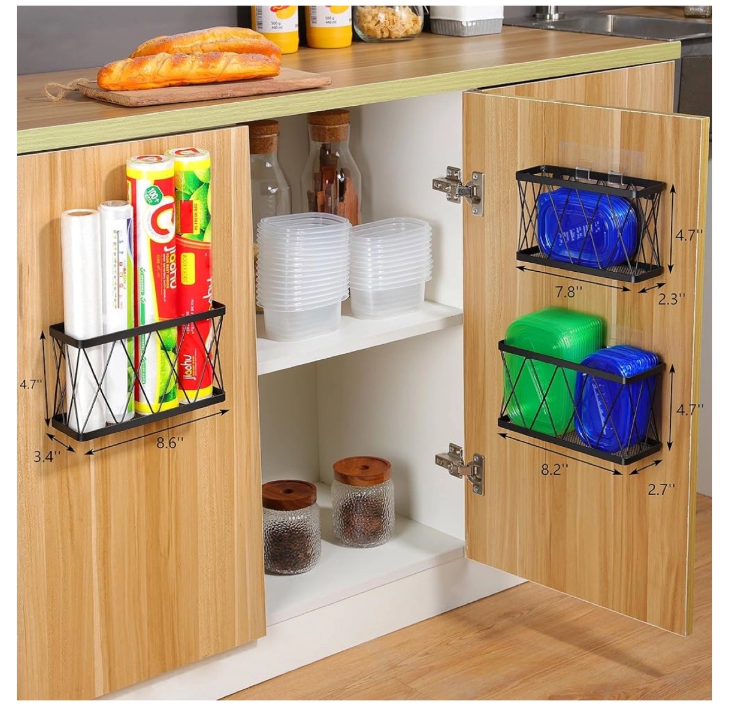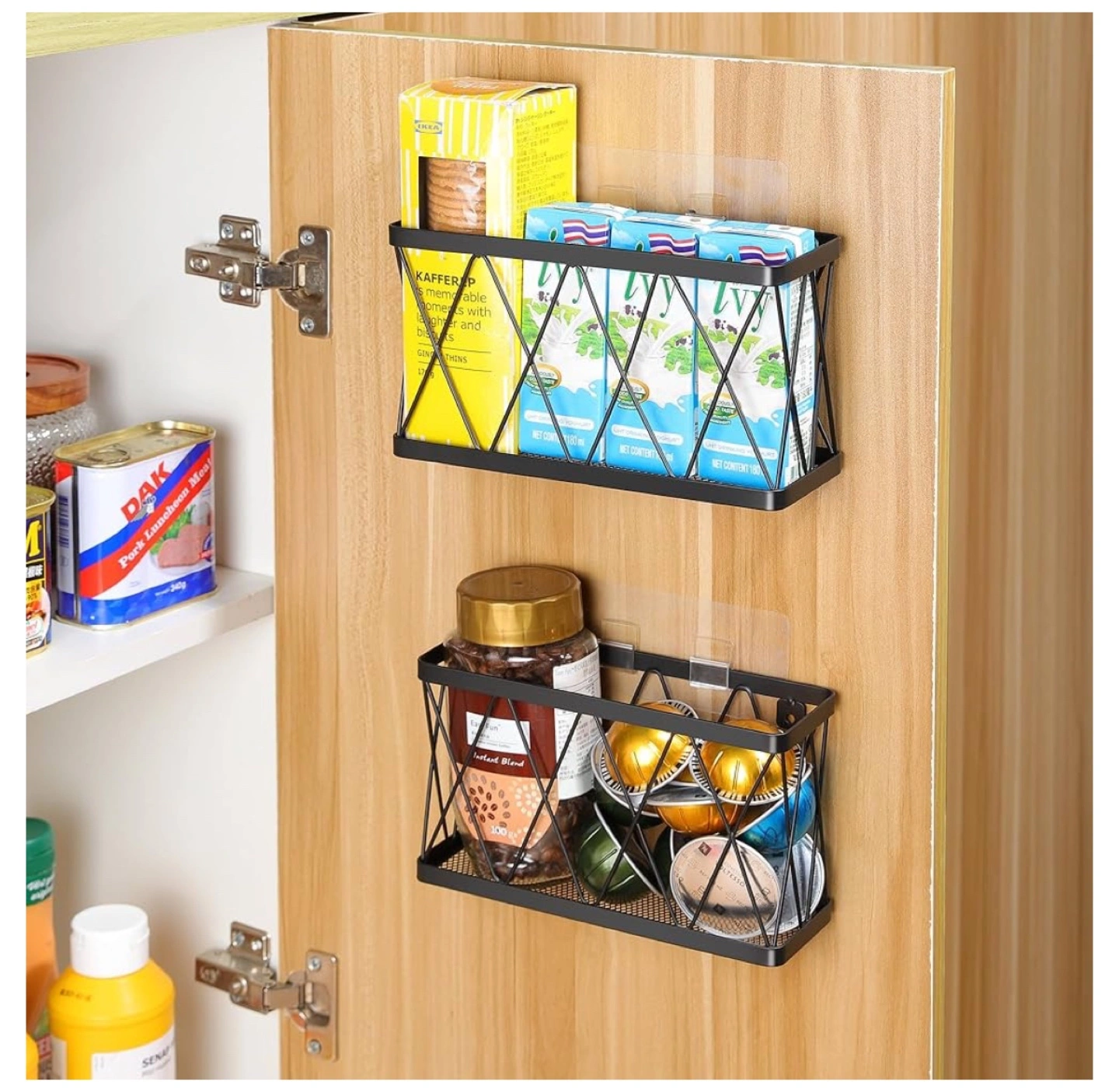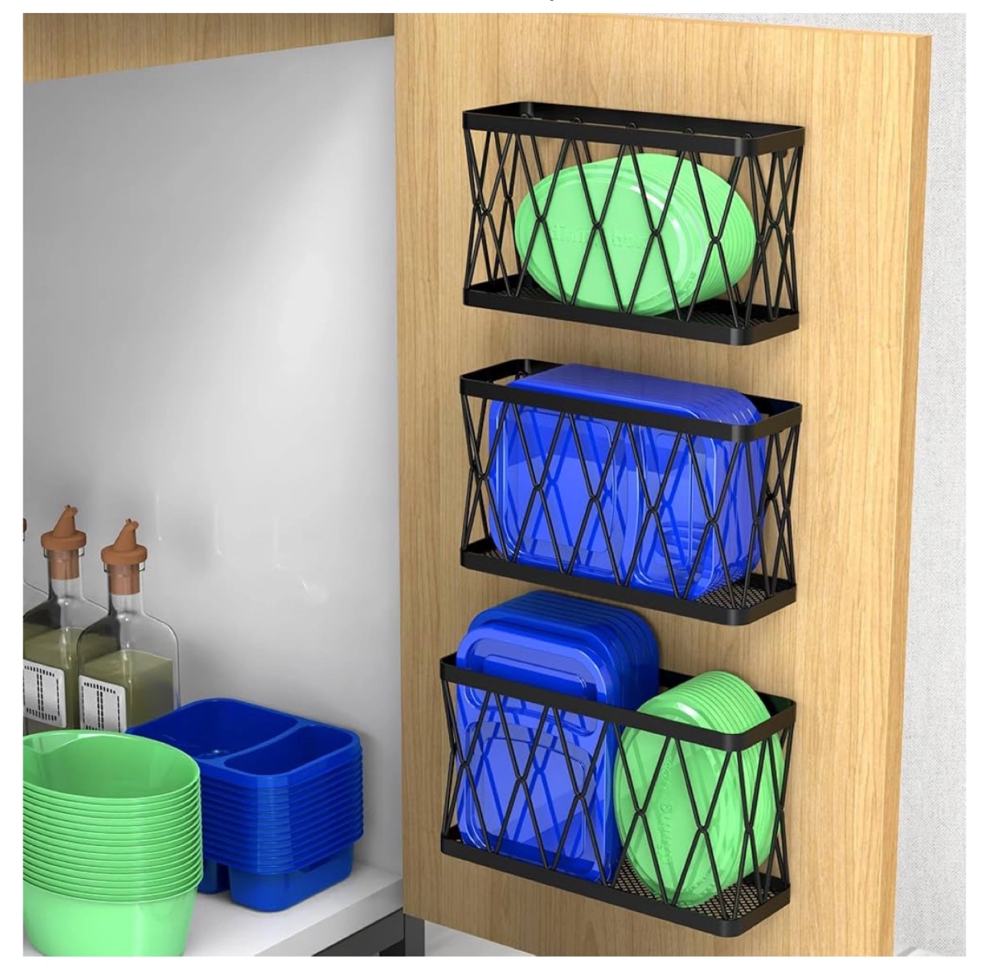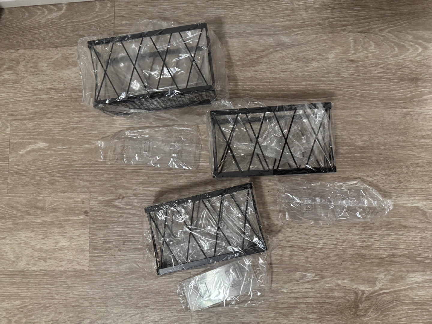 123*CASH Only* Brand New Three black metal wire storage baskets. Ideal for organizing kitchen cabinets or pantries. Mounts easily using adhesive strips. Durable and strong, perfect for storing various items. [Check Out My Other Listings]