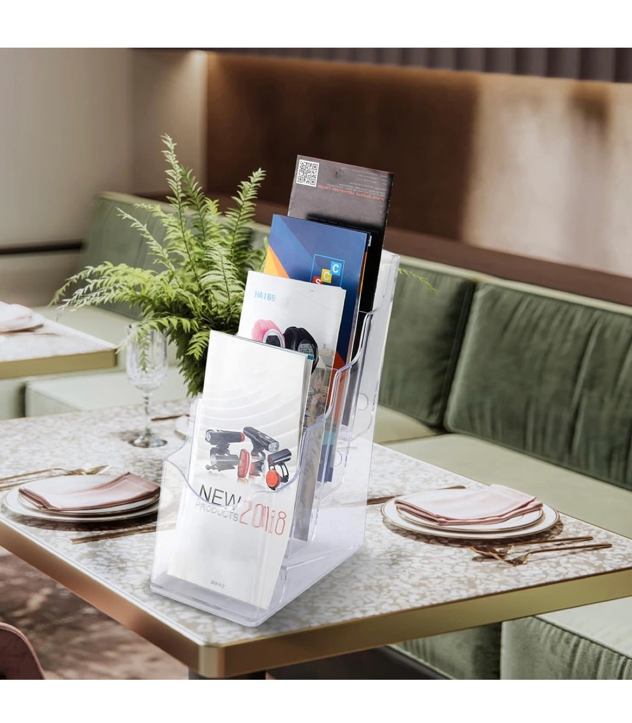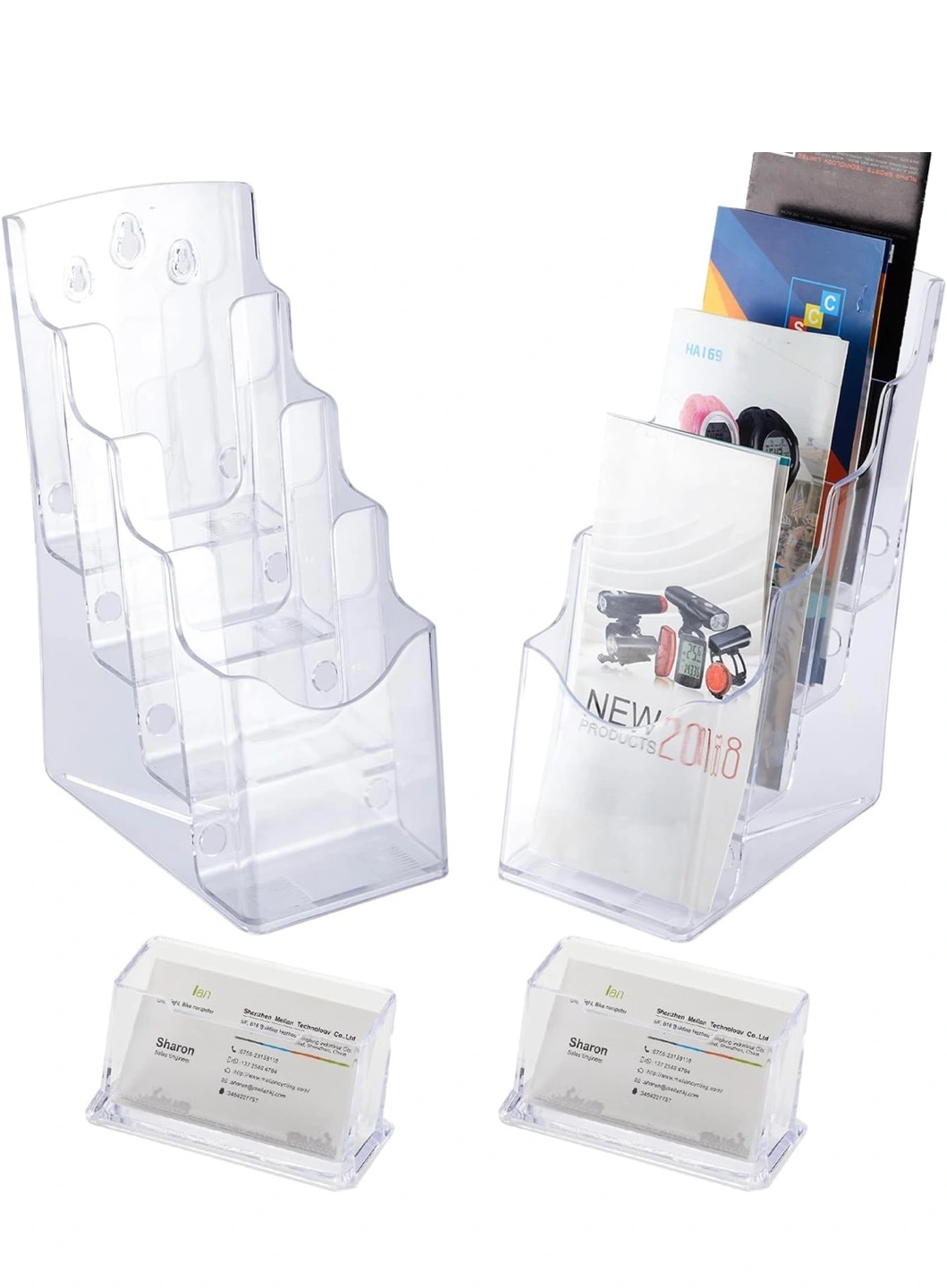 Four-tier brochure holder. Made of clear acrylic. Self-standing design. Anti-slip slots. Perfect for organizing brochures, pamphlets, or business cards. Measures approximately 10 inches tall, 6.5 inches wide, and 4.5 inches deep.