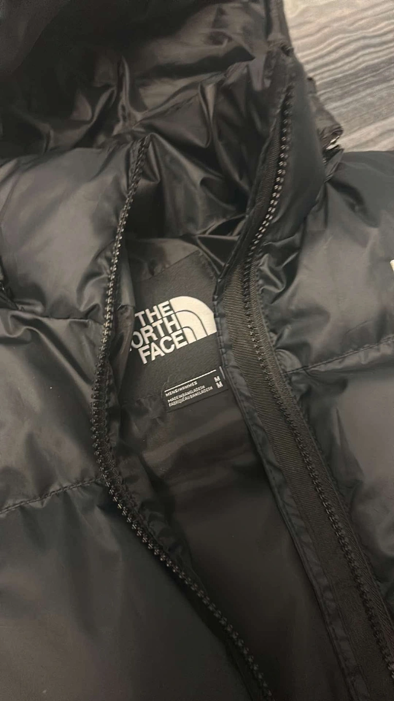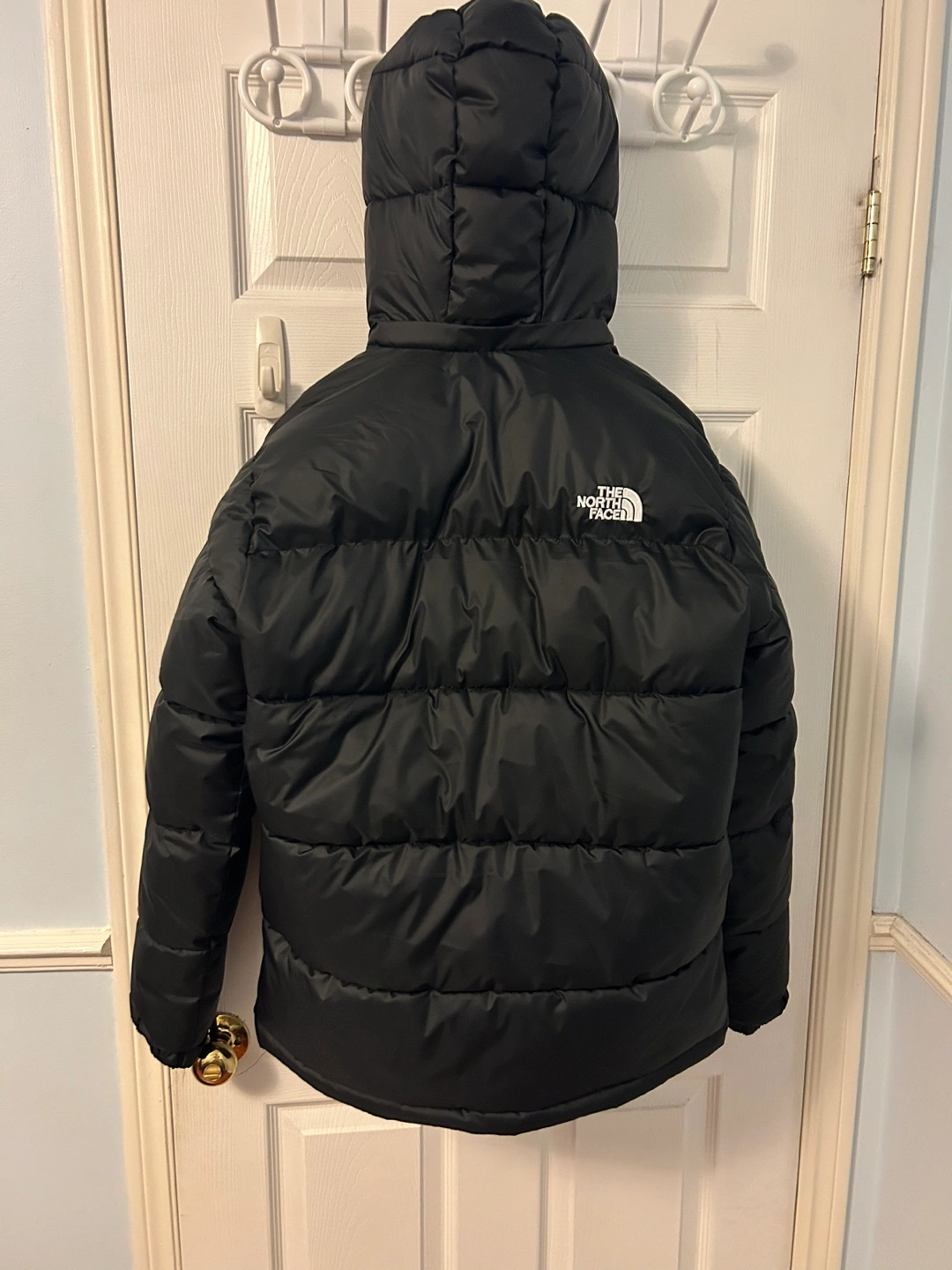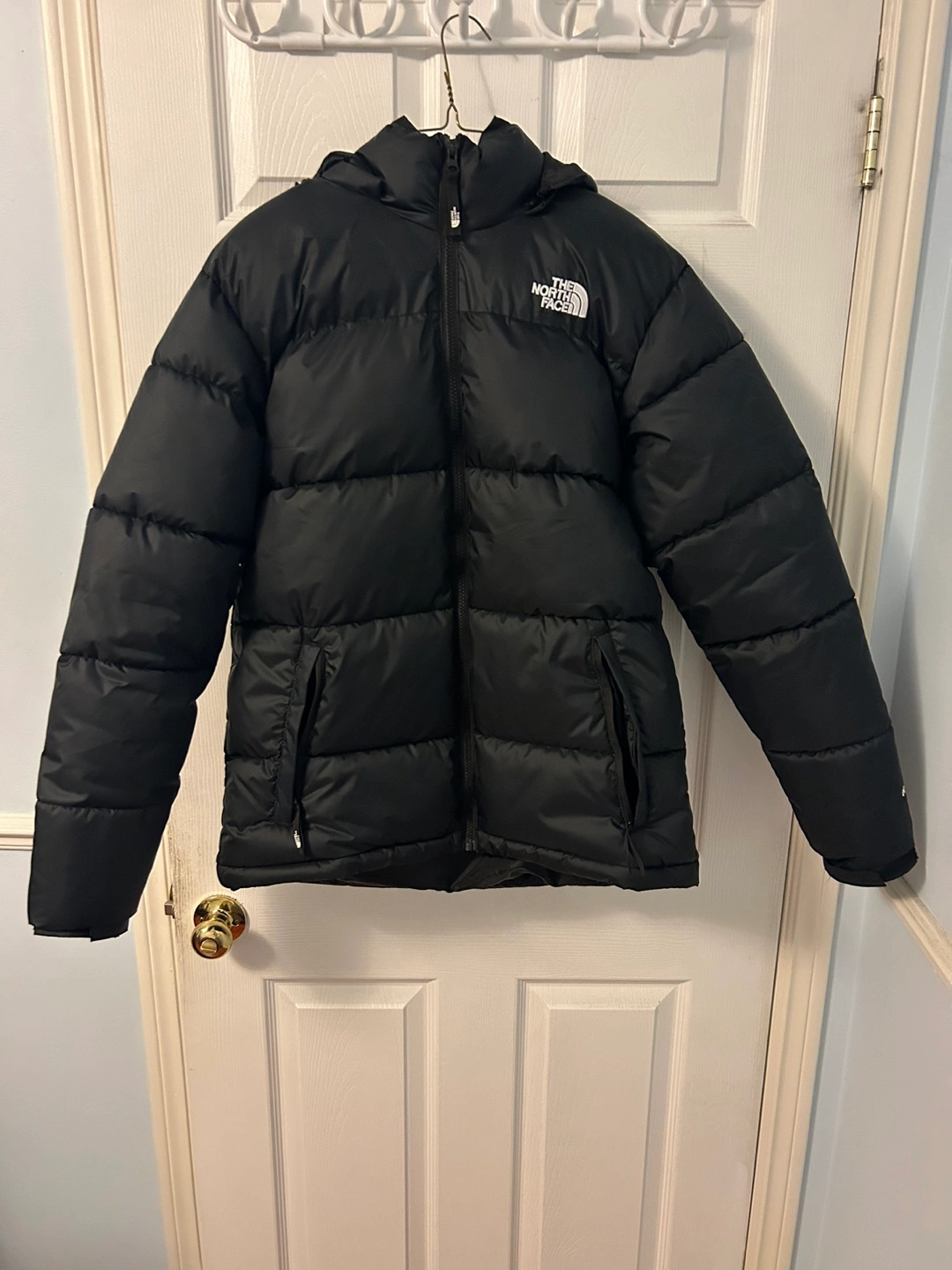 126Black puffer jacket. Features a hood and zipper closure. Good for colder weather. Men's medium.