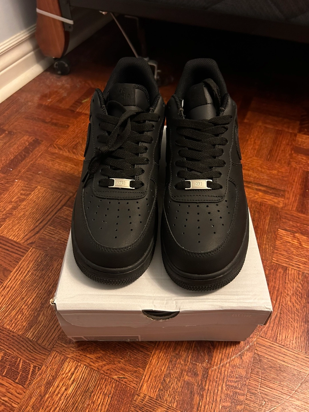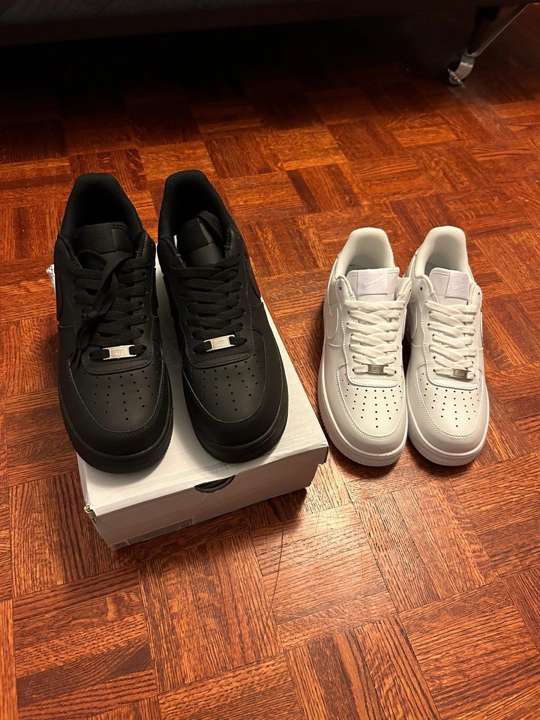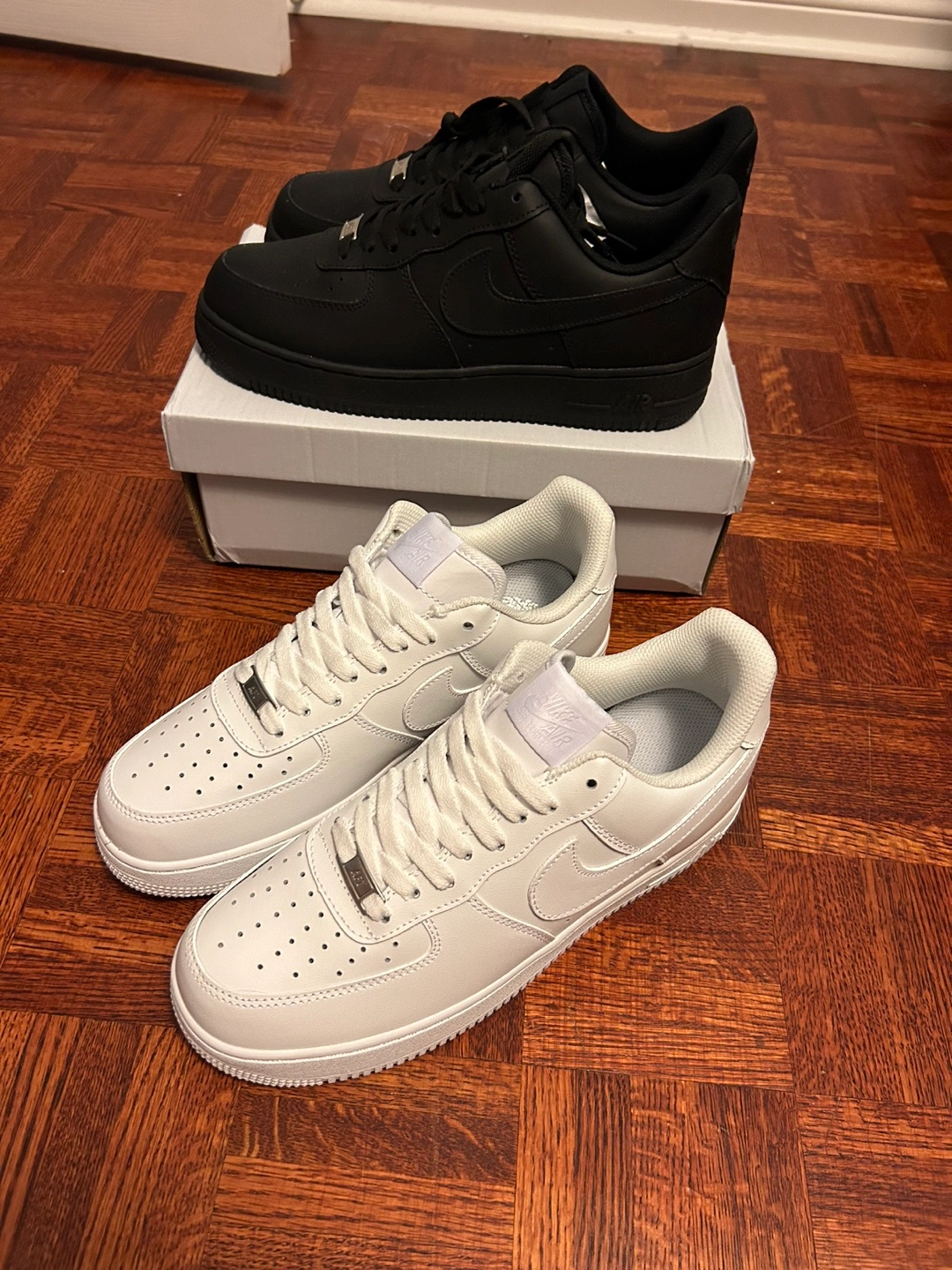 126Pair of Nike Air Force 1 '07 Low sneakers. One pair black, one pair white. Classic design, low-top silhouette. New with box. $95 each.
