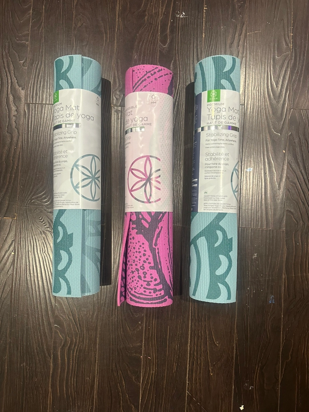 Gaiam premium yoga mats. Stabilizing grip. Various colours and designs. Excellent for yoga anytime, anywhere.