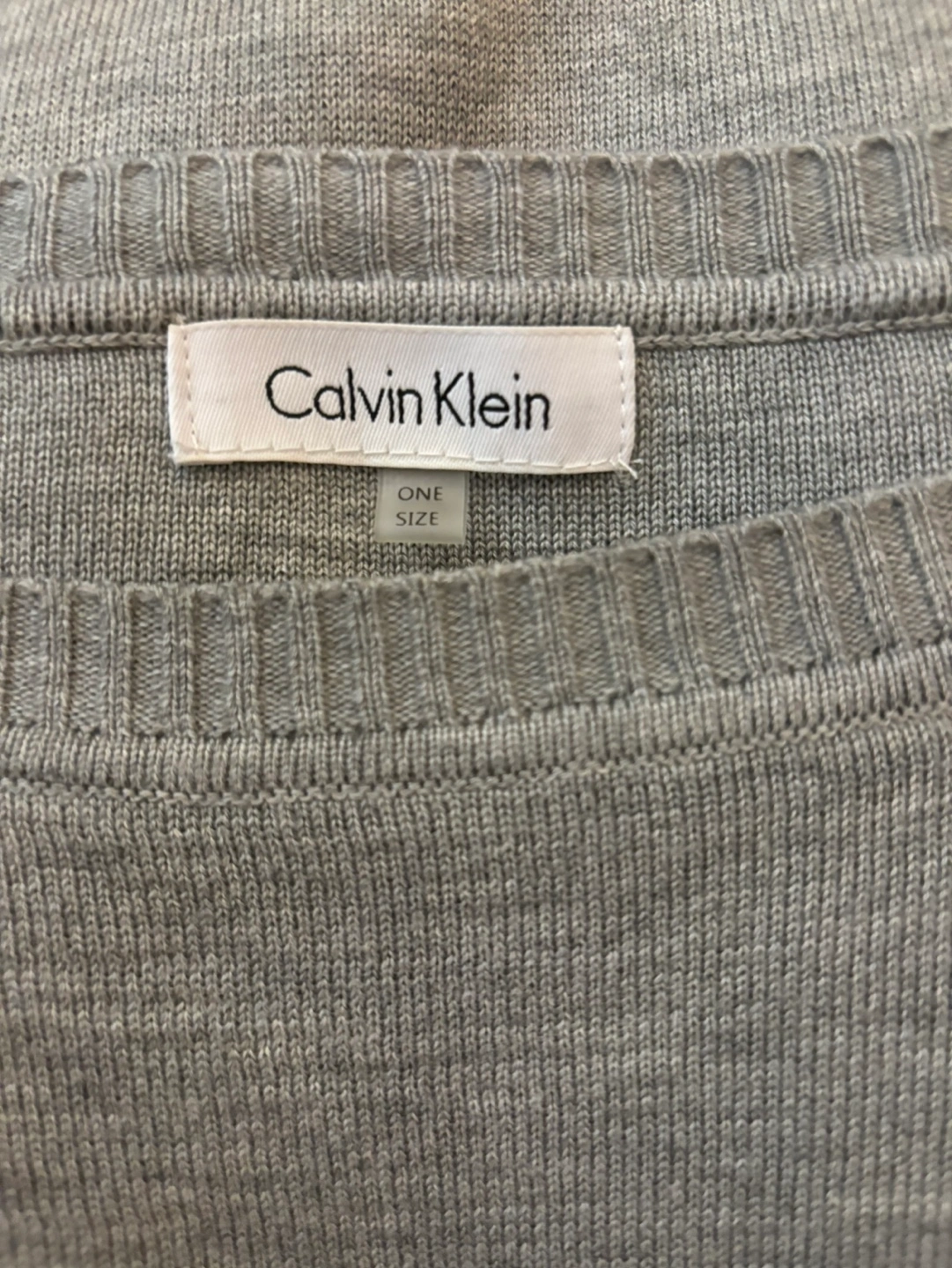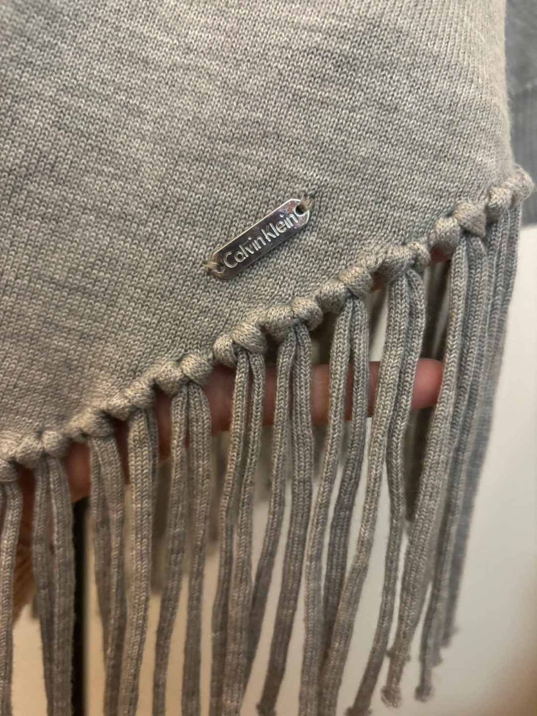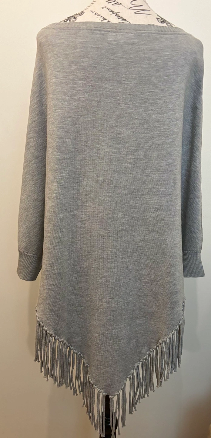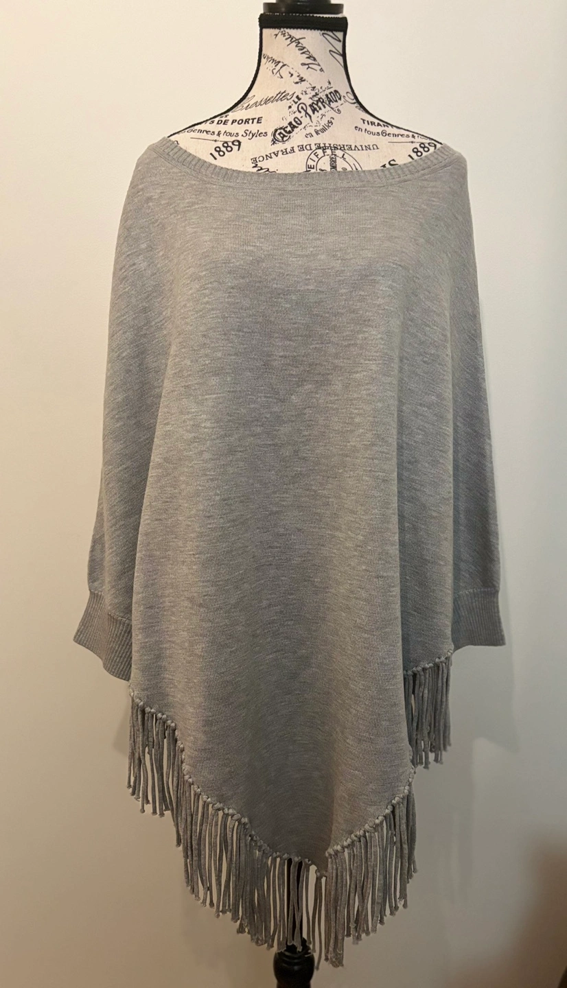 Thick material grey knit poncho by Calvin Klein. Features a fringed hem. Half-sleeve length. Beautiful poncho. One size fits all. Best for medium or large frame. In excellent condition. Cash only.