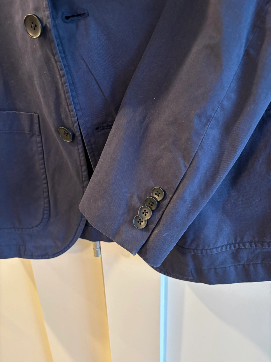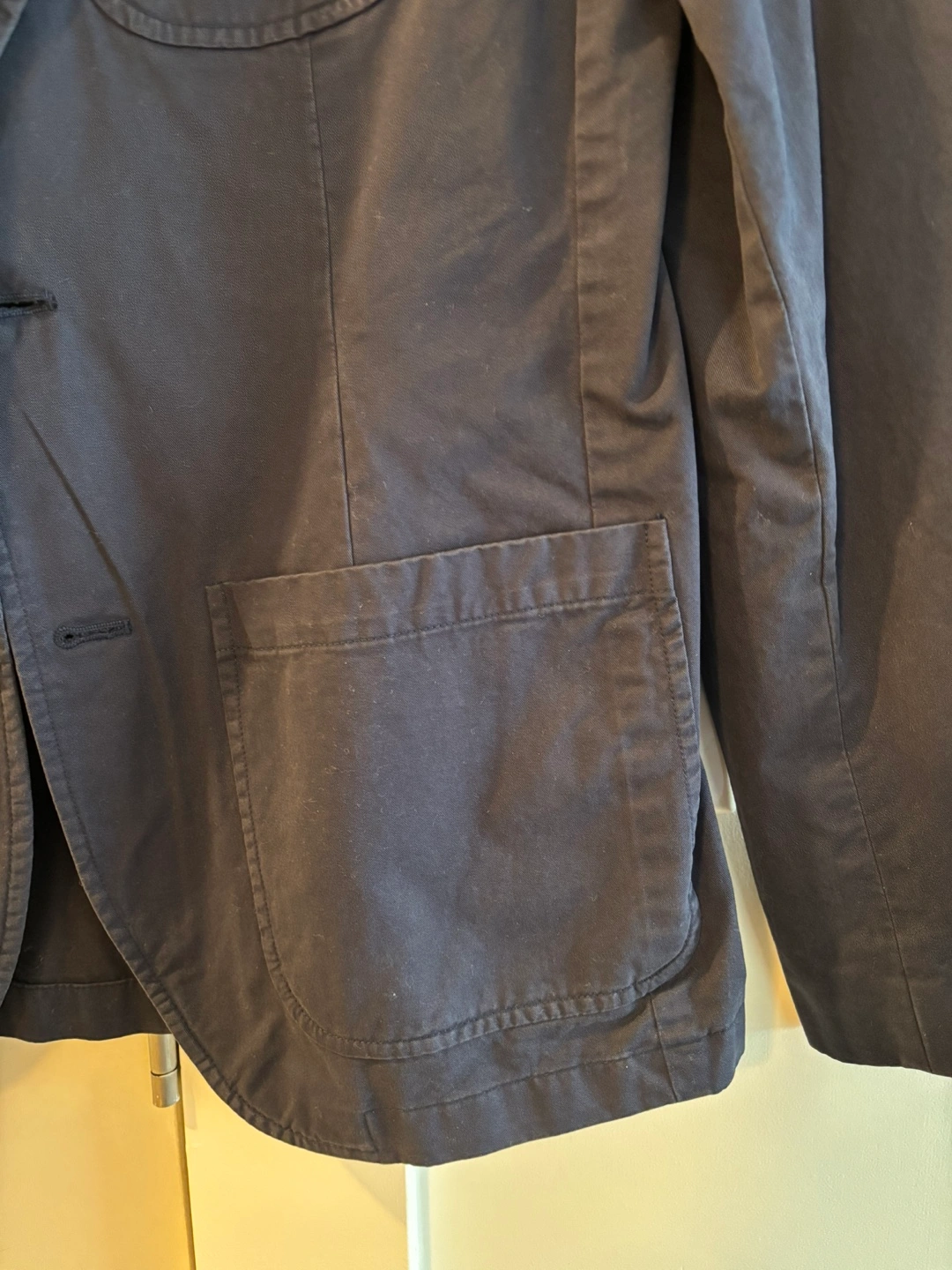 Navy blue ladies blazer. Two button closure. Patch pockets. Size is 38.