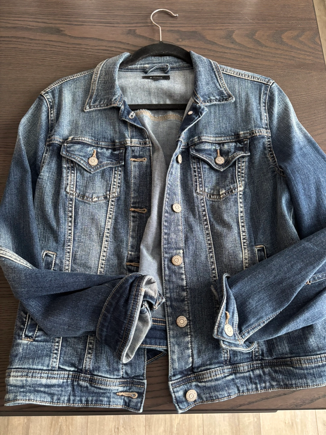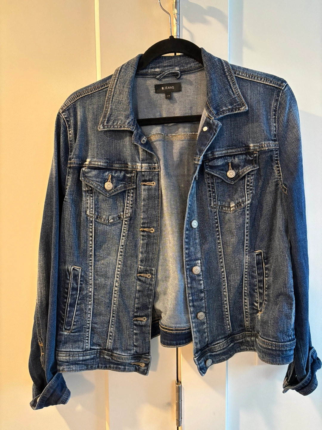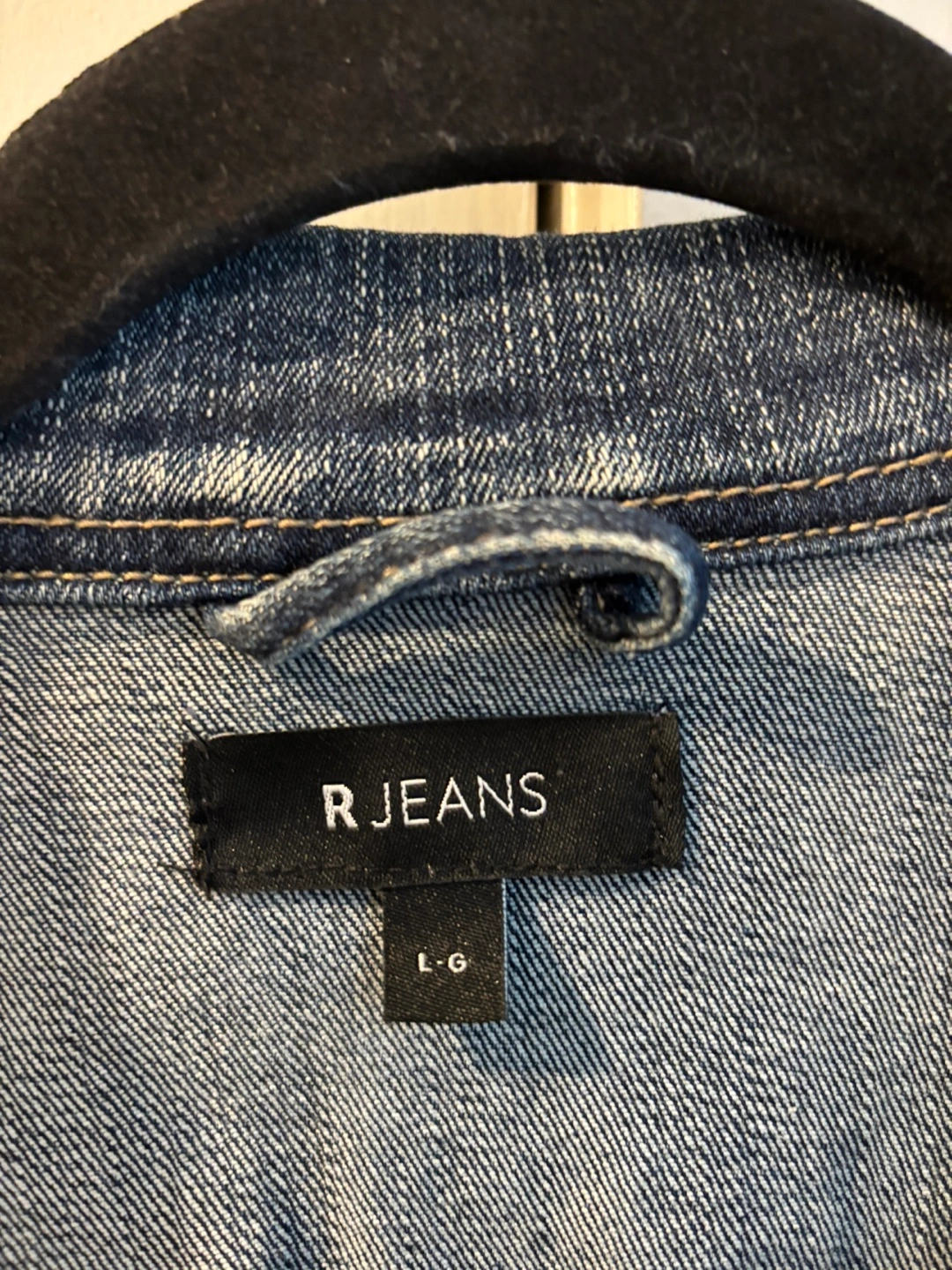 Women's denim jacket. Size large. Blue wash. Long sleeves. Button closure. Two chest pockets.