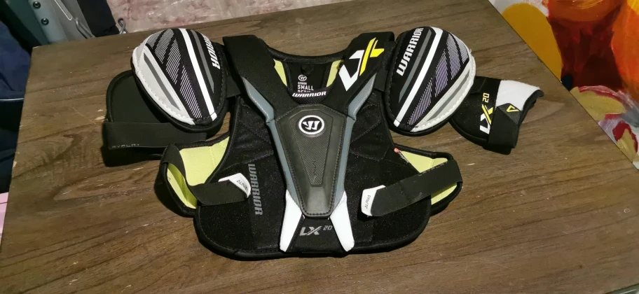 275Warrior LX 20 senior small hockey shoulder pads. Black, grey, white, and yellow accents. Includes arm pads.