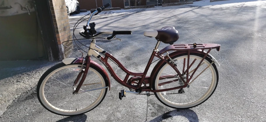 275Red and cream coloured women's cruiser bicycle. Features a comfortable seat, rear rack, and swept-back handlebars. Good condition.