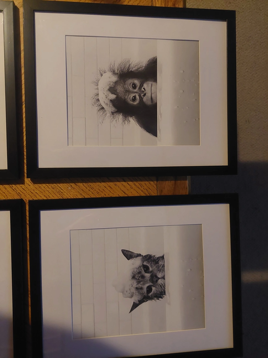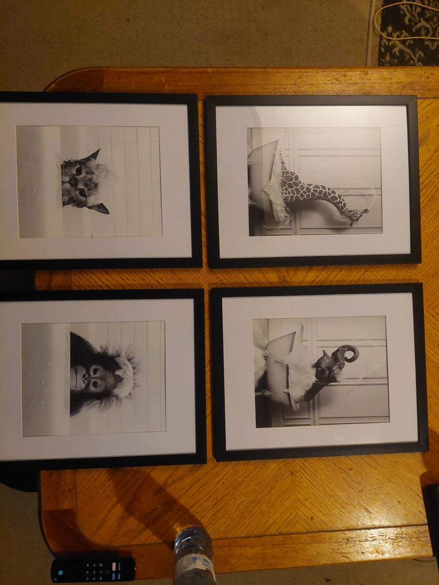 Giraffe and Elephant are $15 each or $25 for both. Cat and Monkey are $10 each or $15 for both. OR $35 FOR ALL. Size of frames are 15 inches by 12 inches. Pick up only (west mountain hamilton) No holds.