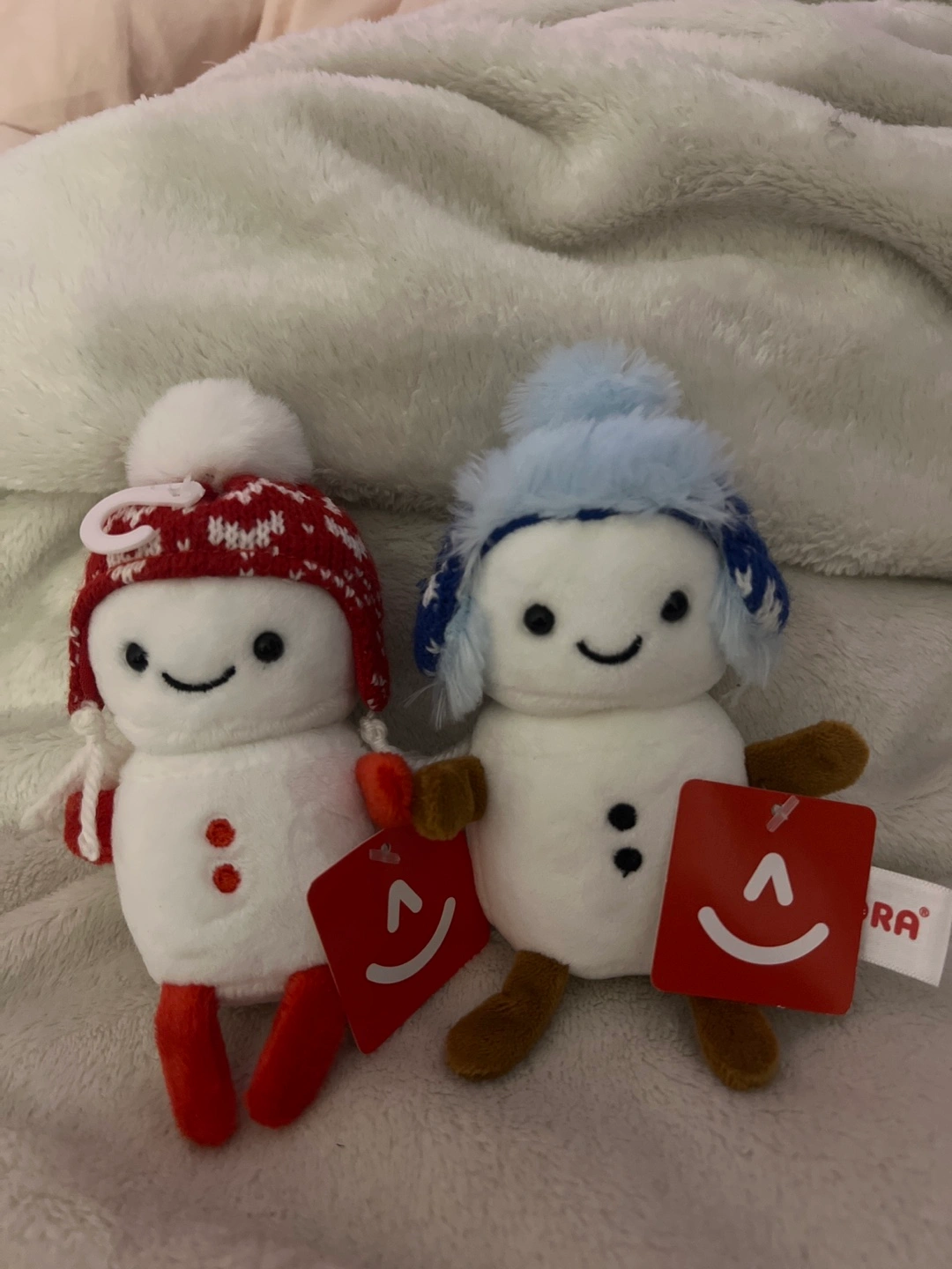 Two cute snowman plushies. Red and blue winter hats. Small and cuddly. Perfect for gifting or collecting. These cuties are still perfectly new with tags š¤