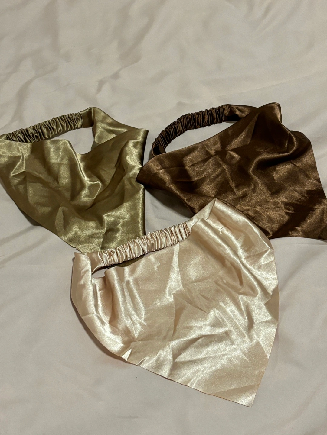Three silky hair scarves/bandanas. Champagne, gold, and brown. Needs to be ironed.