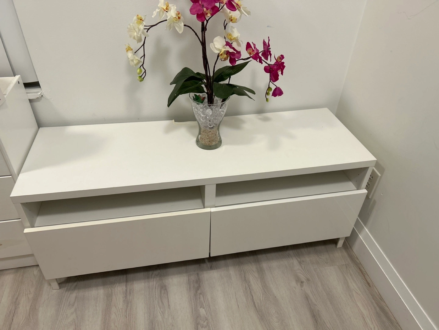 Clean, white TV stand. Two drawers for storage. Good condition. Simple design. Perfect for small spaces.