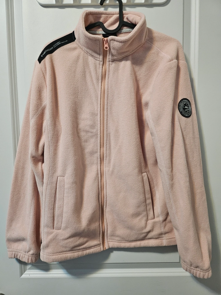 Women's light pink fleece zip-up jacket. Features a high collar and pockets. Good condition.