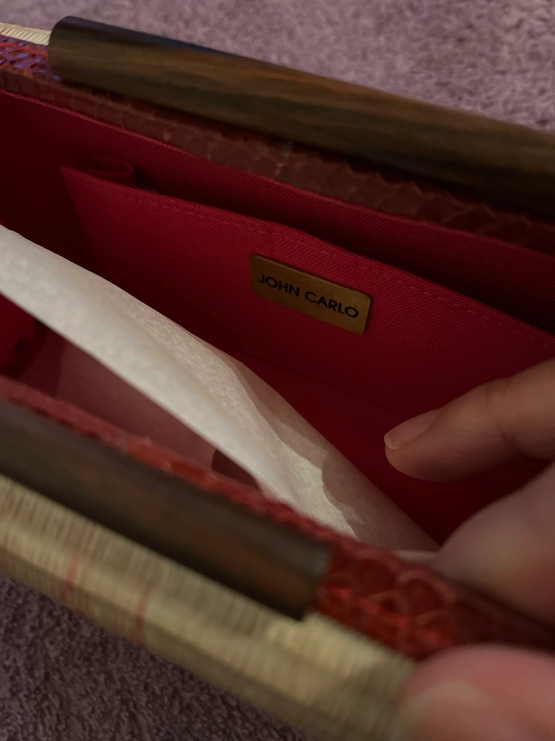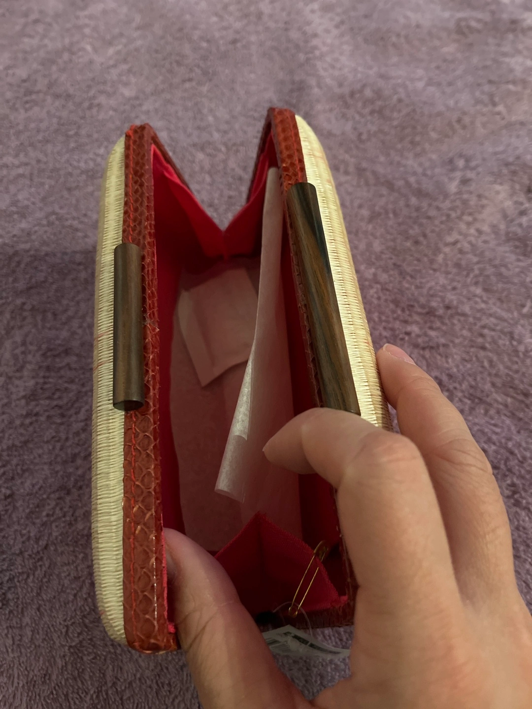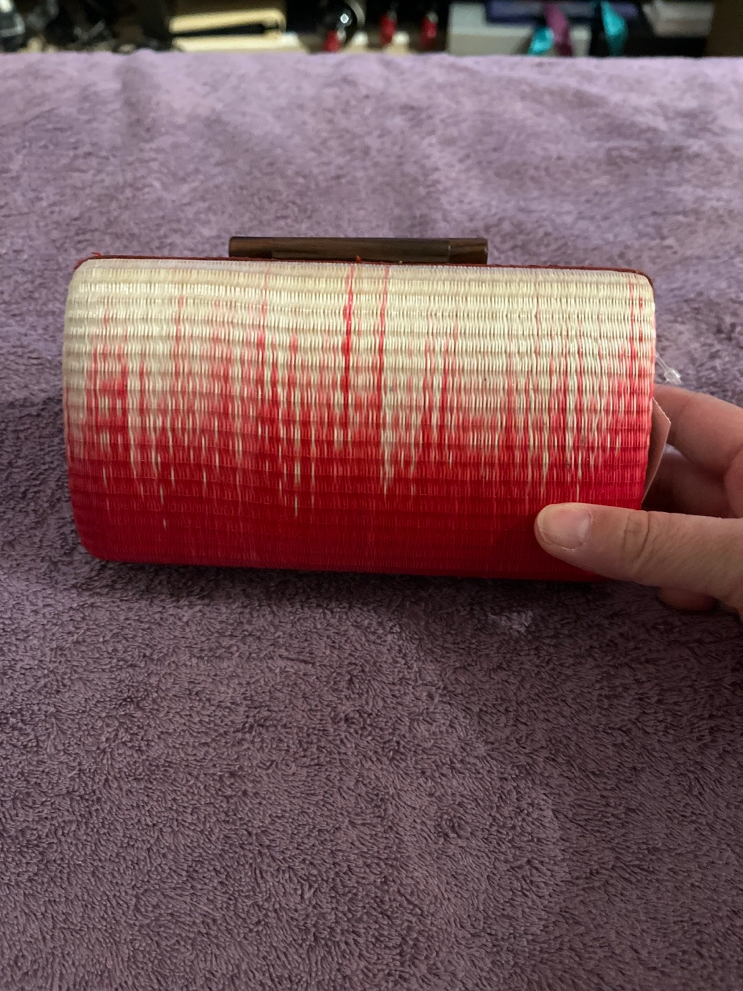 Unique woven clutch. Red and white ombre design. Wooden clasp. Interior features a small slip pocket. Excellent for evening events. Brand new. Never used. Tag still on. Local Artist from the Philippines