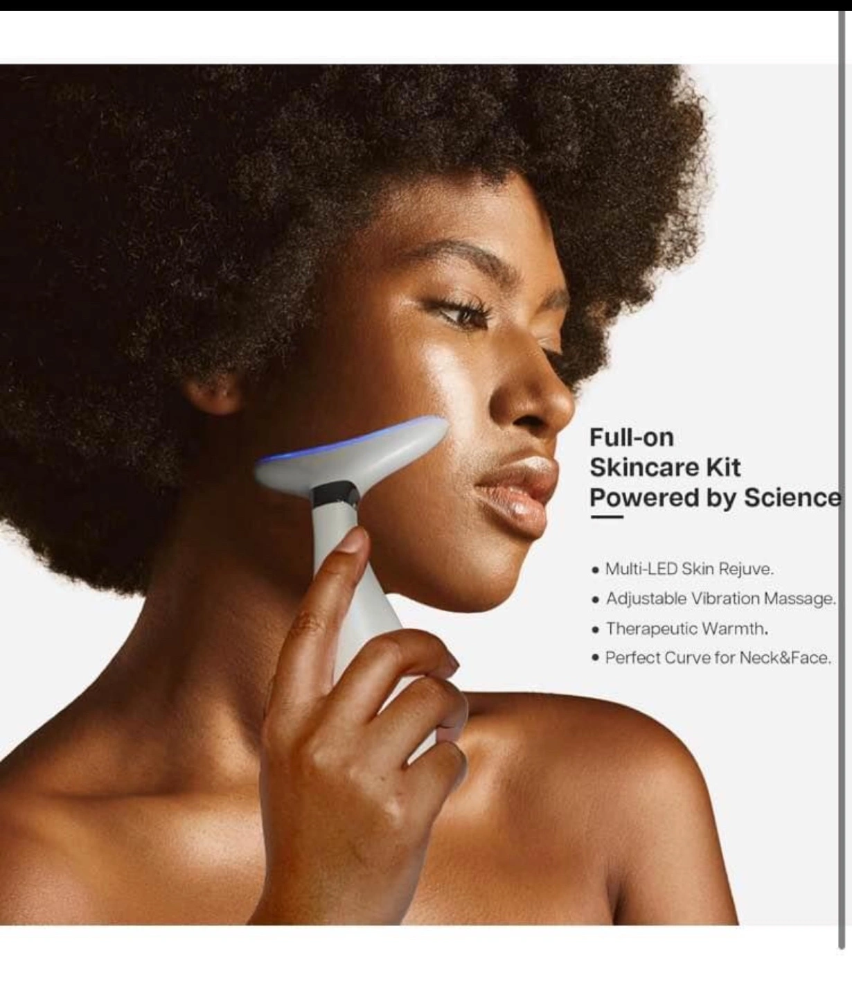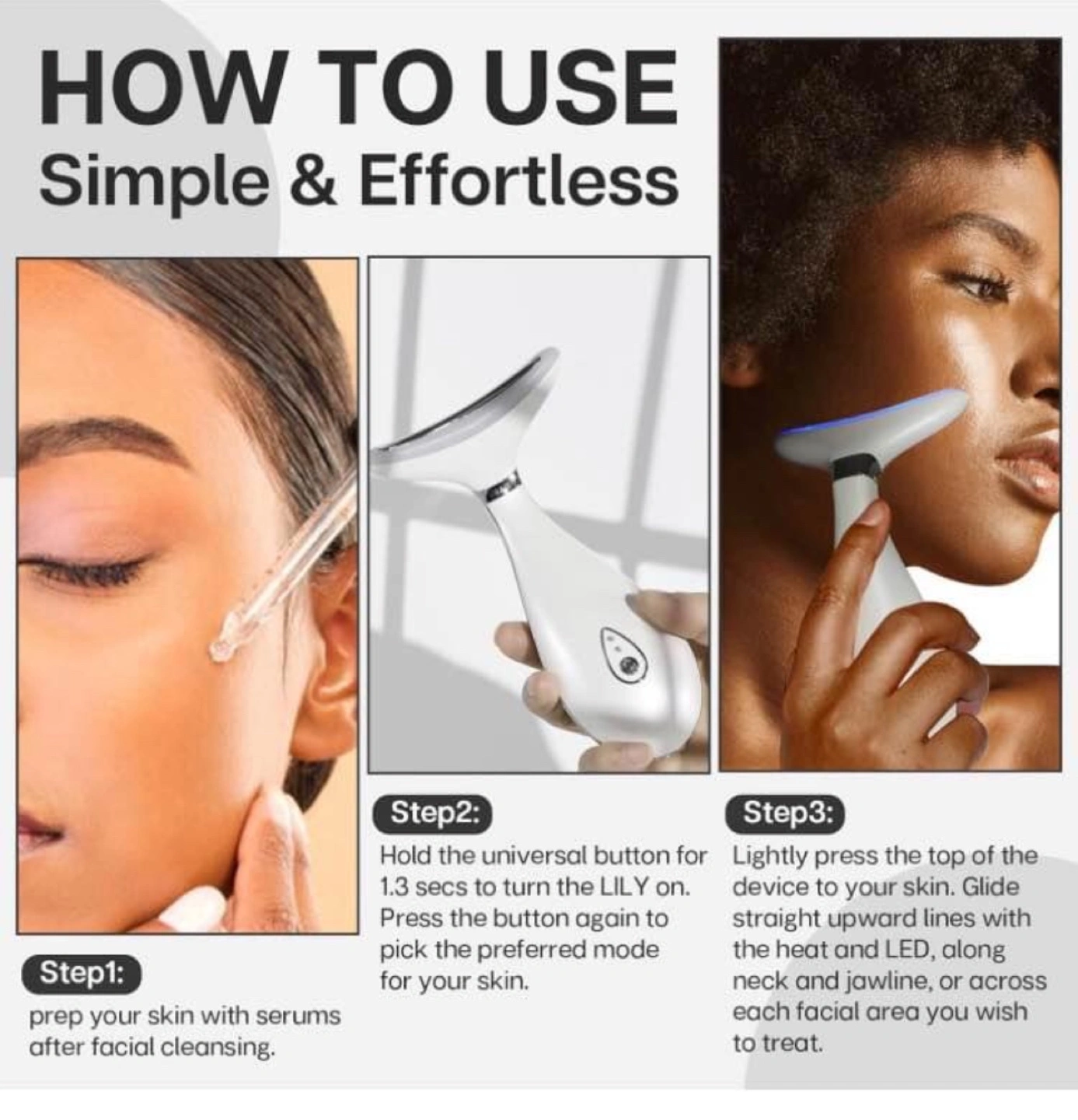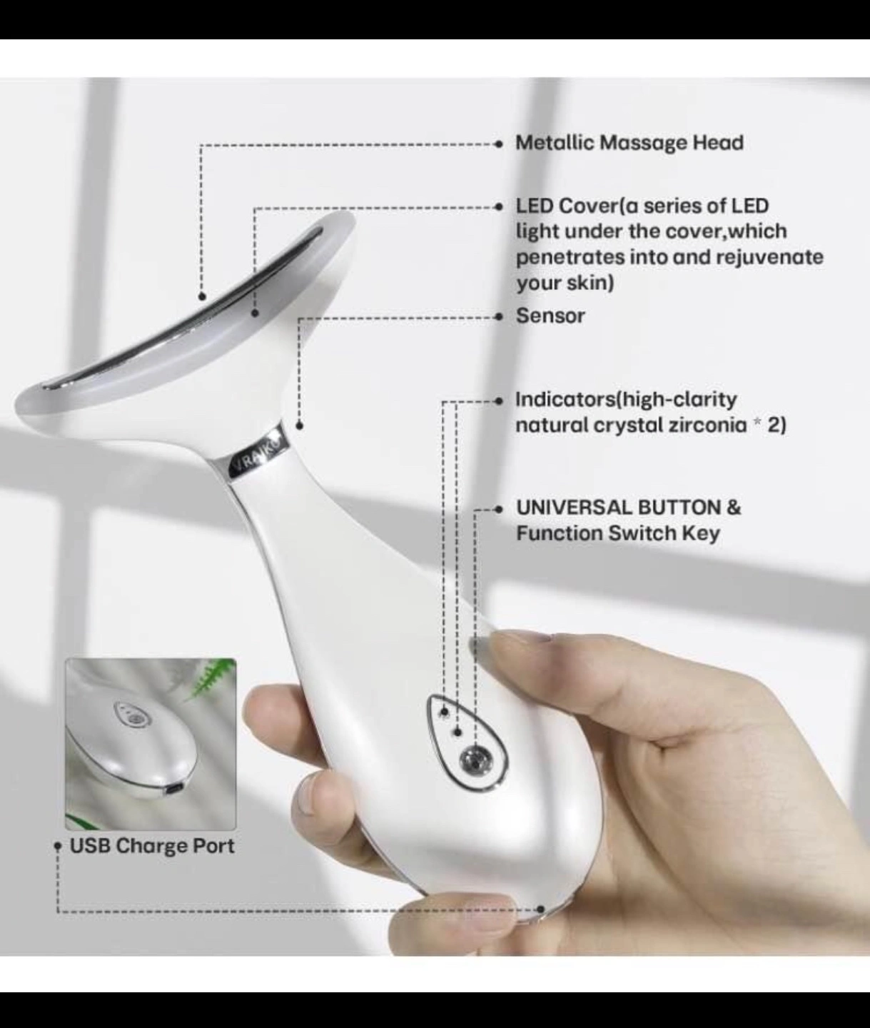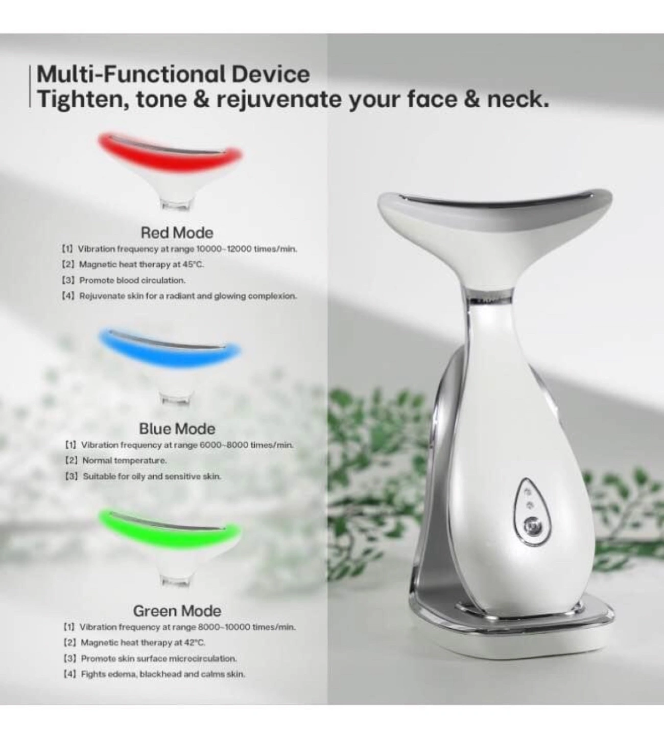 Multi-functional device. Tighten, tone & rejuvenate your face & neck. Features LED light therapy, thermal therapy, and vibration massage. Three colour modes: red, blue, and green. Perfect curve for neck and face.