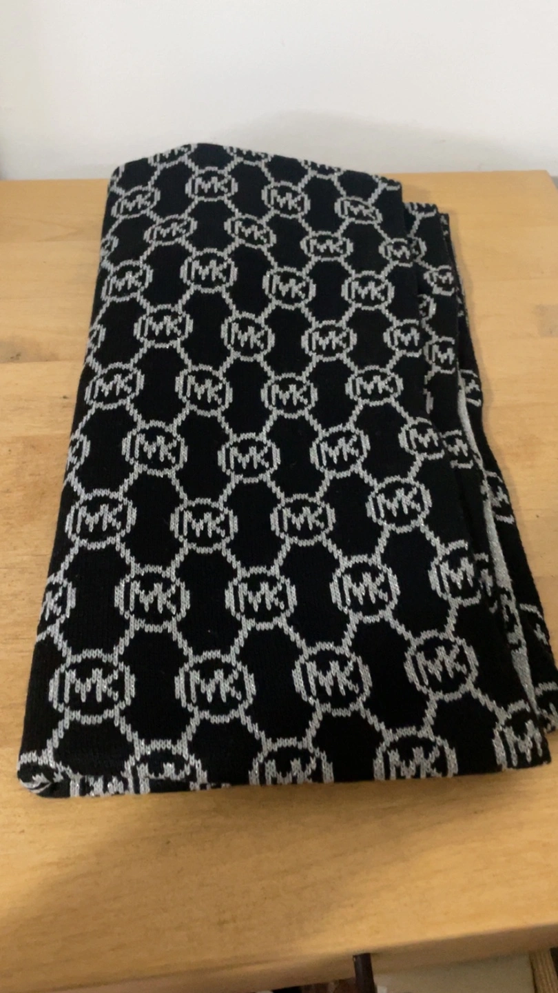 Warm and stylish knitted scarf. Features a repeating MK logo pattern. Perfect for fall and winter.