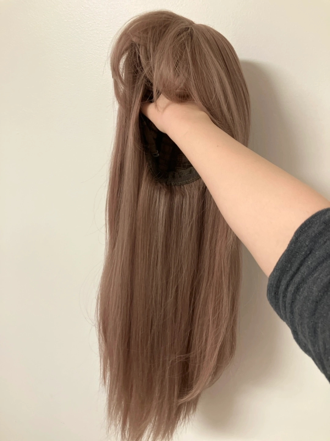 Long, straight brown wig. Features bangs. Synthetic material. Ready to wear. Has a slight pink and blonde touch.