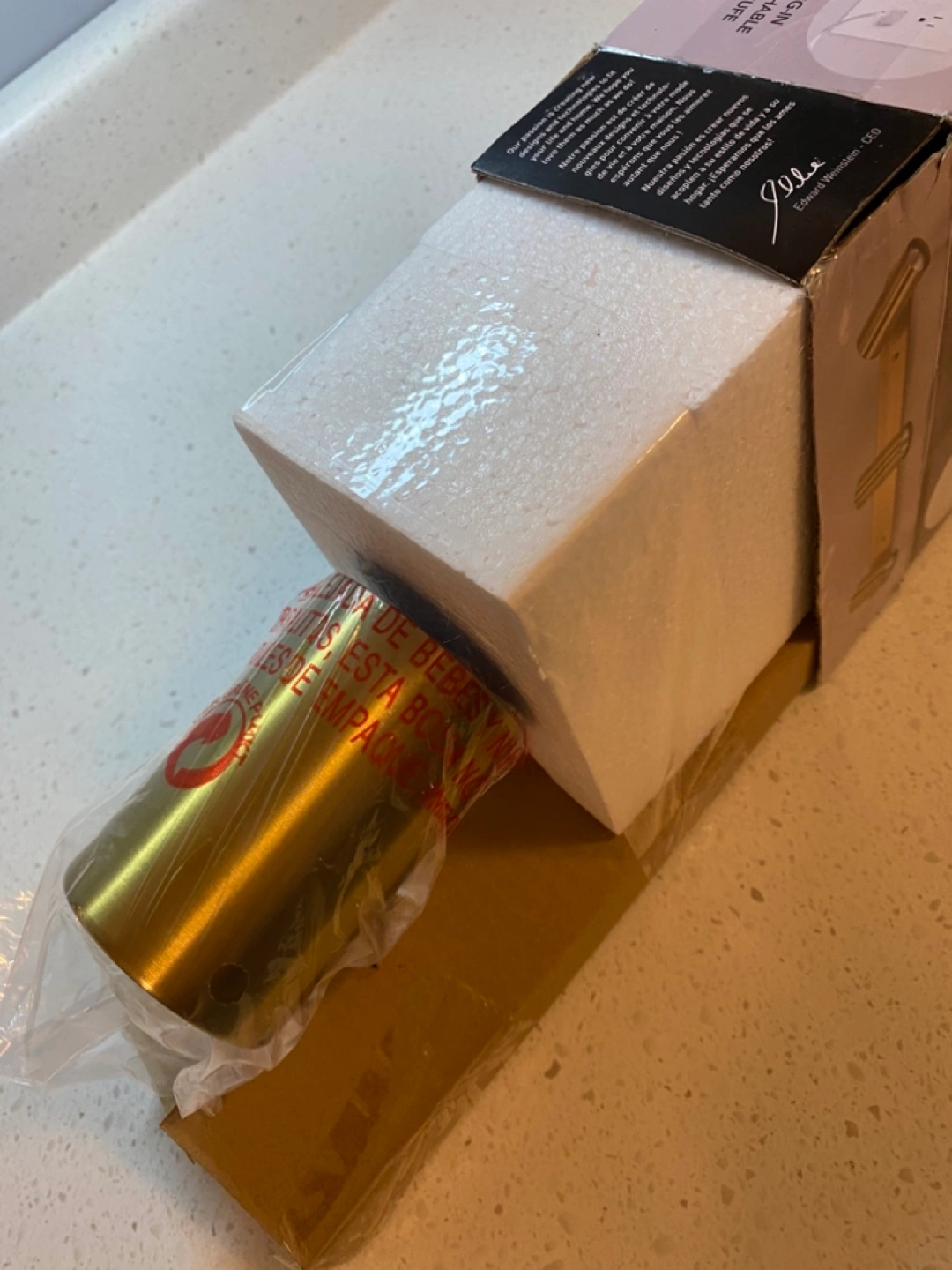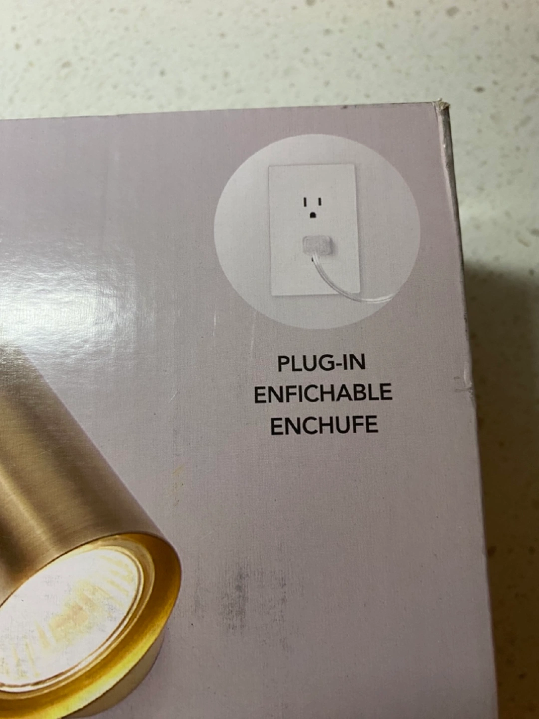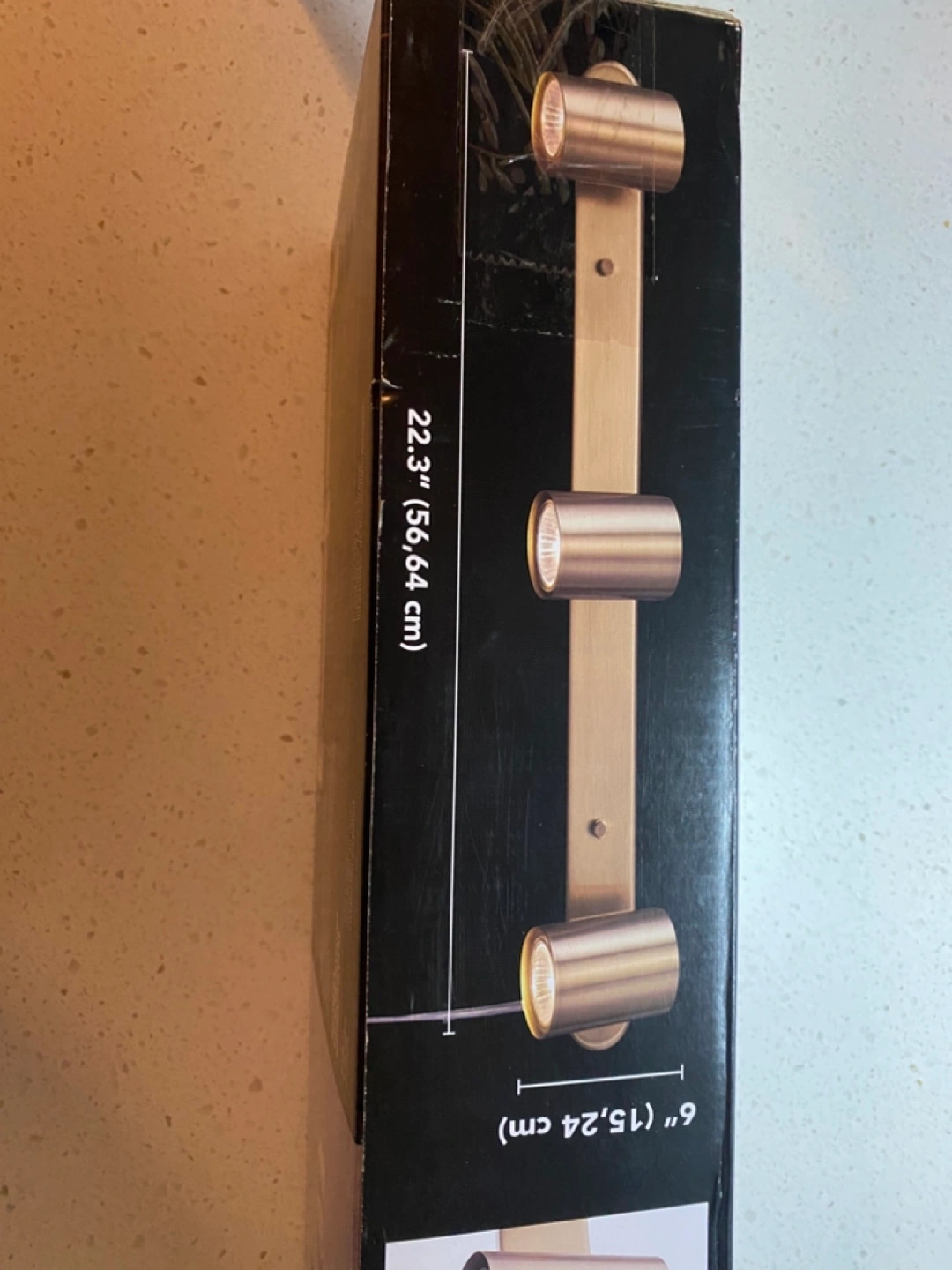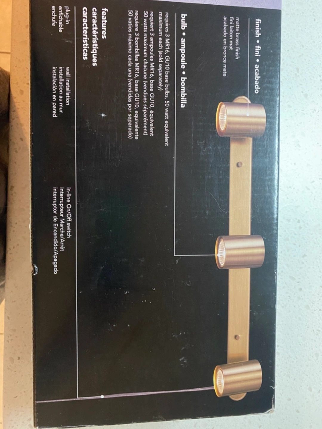 Brand new in box. Three-light vanity fixture. Brushed brass finish. Plug-in design. Easy installation. Requires three 50-watt equivalent bulbs (not included).