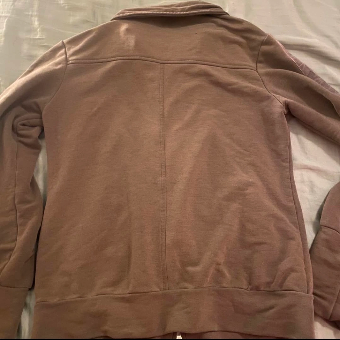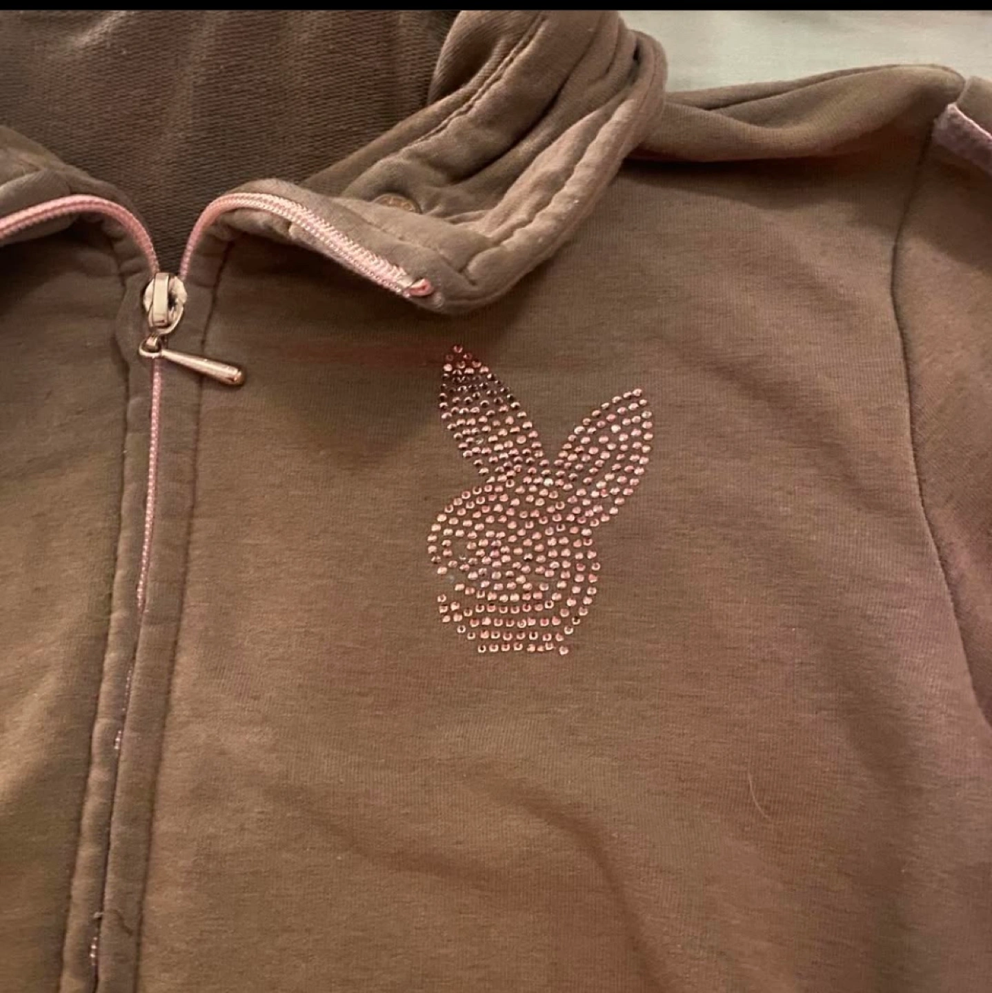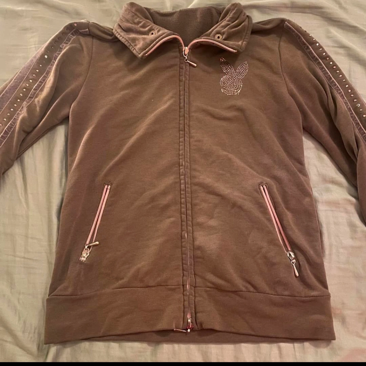 24Brown zip-up jacket. Features a Playboy bunny logo in rhinestones. Pink zipper and accents. Long sleeves. Two pockets. some gems missing