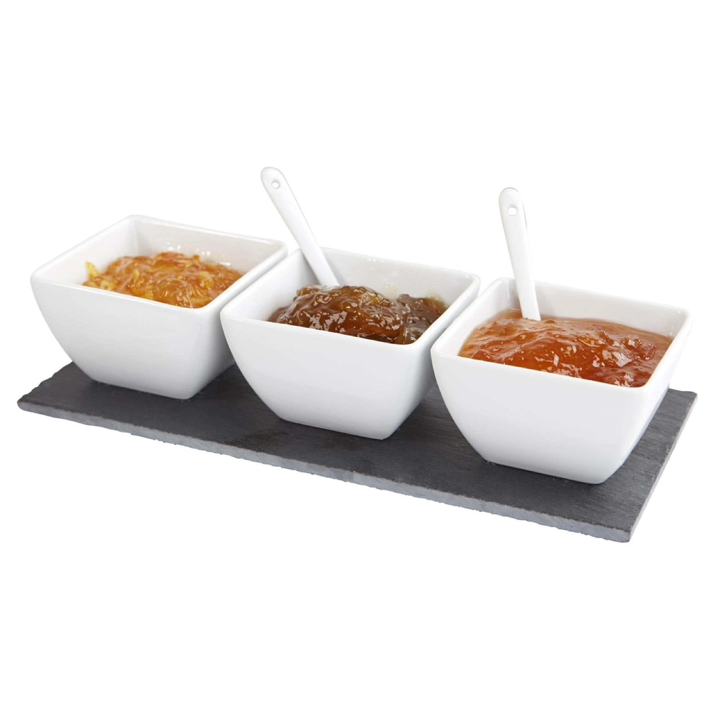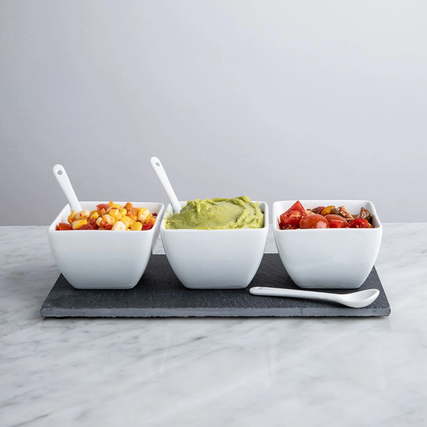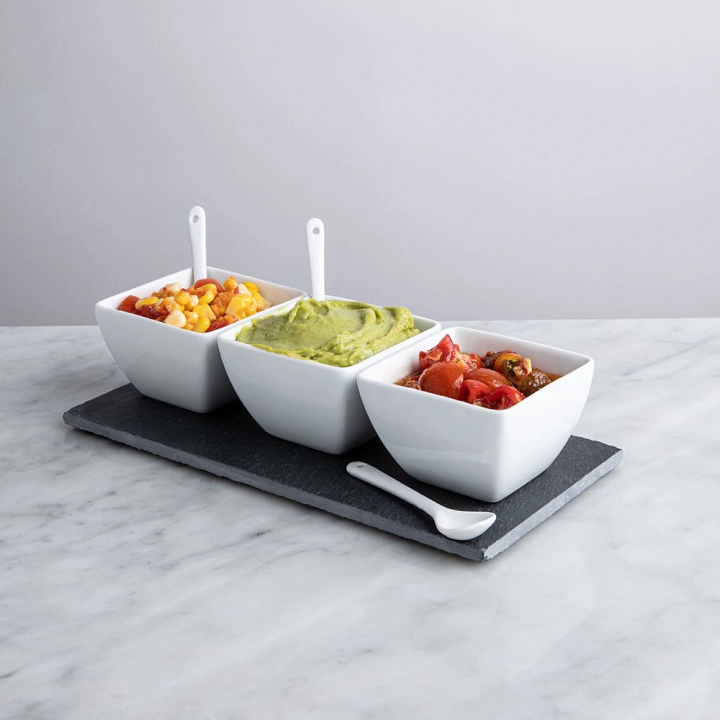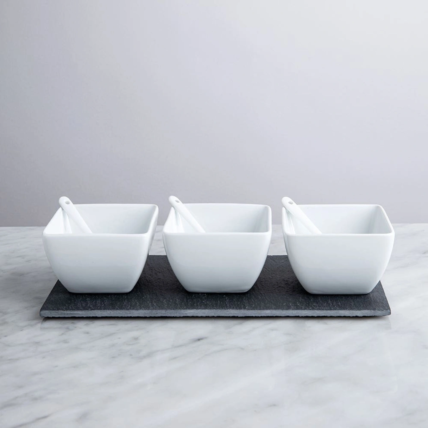 1000+Set of three KSP (Kitchen Stuff Plus) white porcelain bowls on a grey slate serving tray. Includes three small spoons. Perfect for serving appetizers, dips, or condiments, and you can also just use the marble slate to serve sushi 🍣 Brand new, it was a housewarming gift but I don’t have the box.