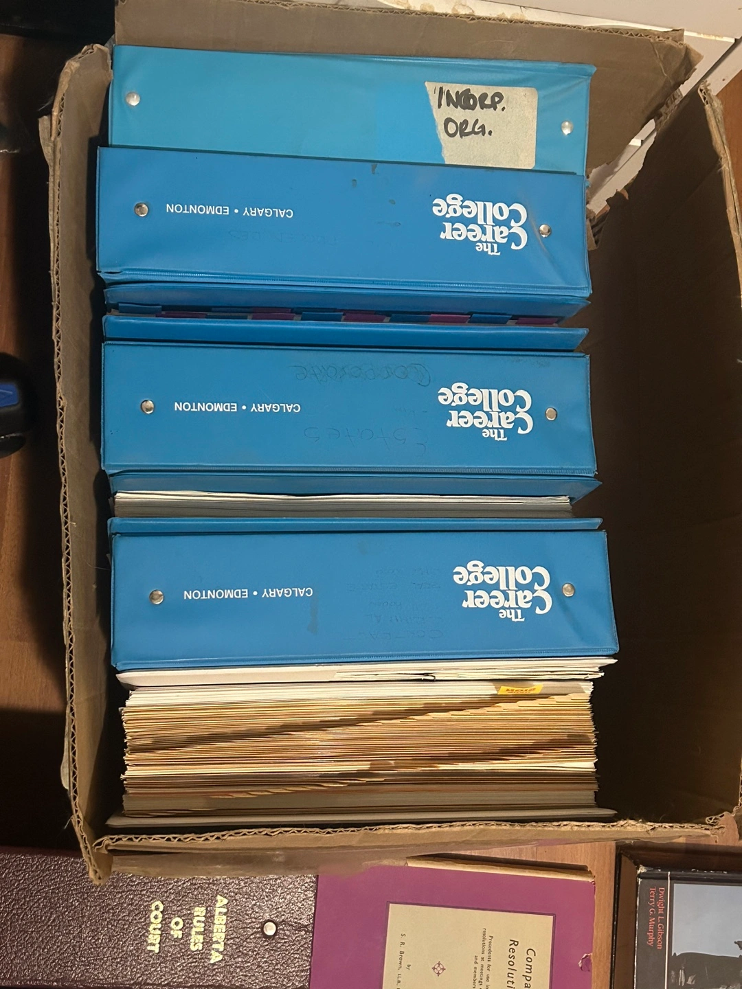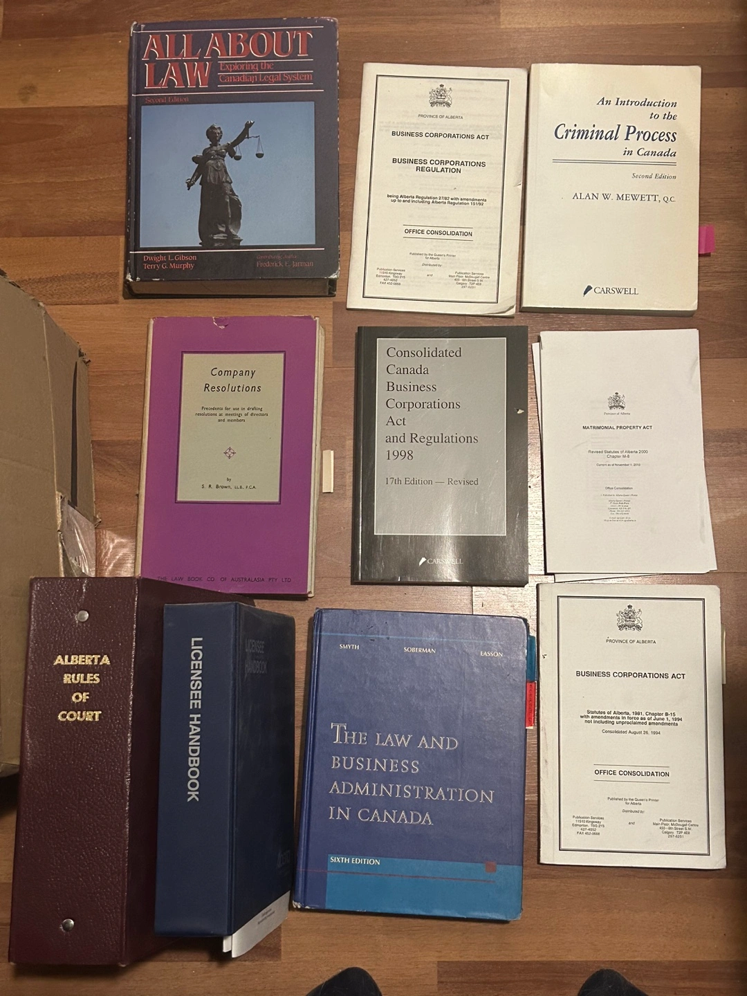 Lot of 10 legal textbooks and 7 school binders. Included in school binders from The Career College with various subjects notes and assignments. Various titles on business and corporate law, criminal process, estates law, real estate law and Alberta rules of court. This was the full paralegal course plus extras. Very useful.