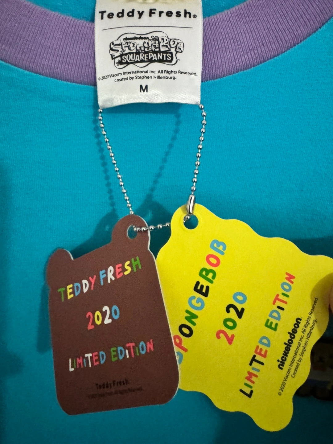 360Men's size medium teal t-shirt. Features purple and yellow trim on the collar. Spongebob Squarepants graphic on the front. Limited edition collaboration with Teddy Fresh. Brand new with tags. Teddy Fresh x Spongebob 2020 Limited Edition (Medium) Condition: Brandnew still tag attached Price: 45 cad cash or best offer Location: 807 Brimley Road Scarborough (pick up location) Meet up: Line 1 or Line 2 subway or downtown Please see my other listing. Happy Shopping.